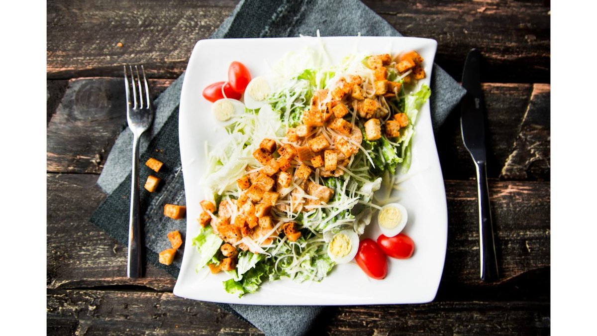 Айсберг, черри, перепелиное яйцо, лист салата, сыр пармезан, гренки, креветки, соус цезарь