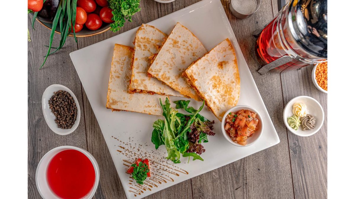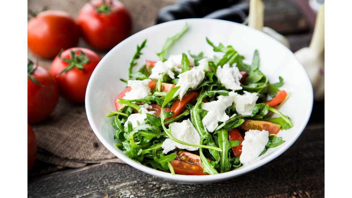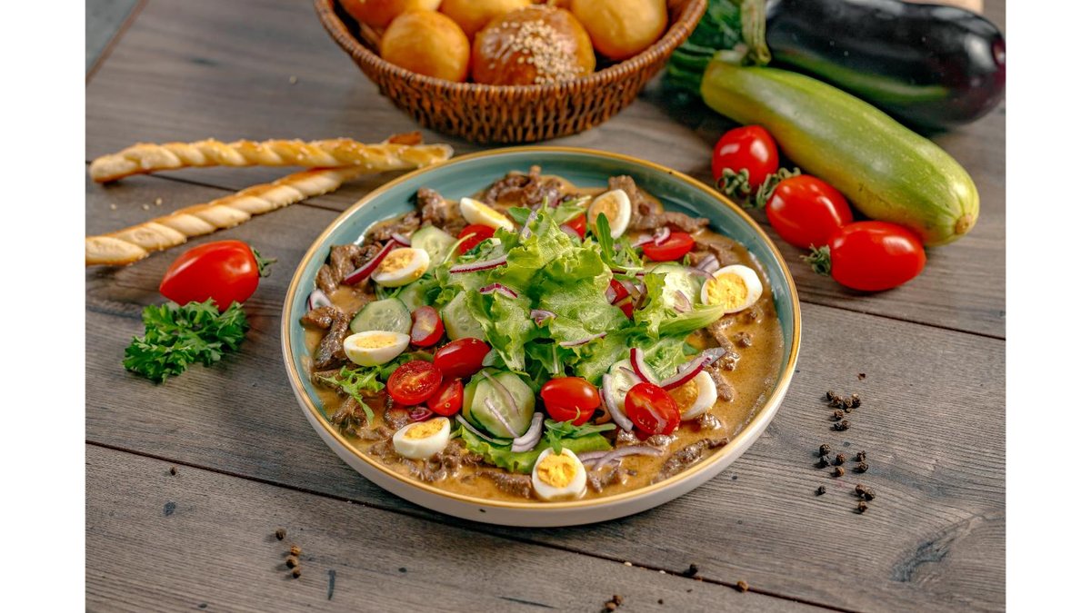 Вырезка конины, рукола, яйцо перепелиное, черри, огурец, красный лук, лист салата, соус терияки, уксус бальзамический, майонез