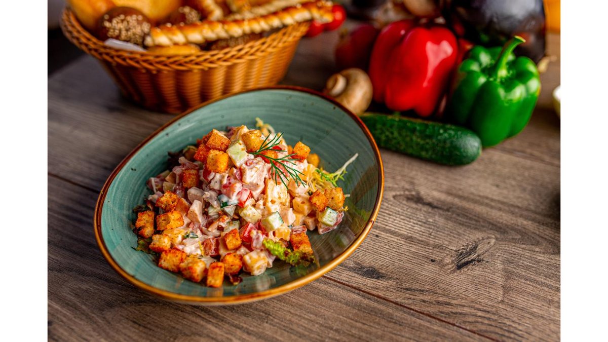 Помидоры, огурец, сыр, гренки, копченый куриный рулет, лист салата, майонез