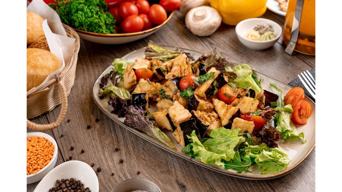 Баклажаны в кляре, сыр фета, помидор, чесночный соус