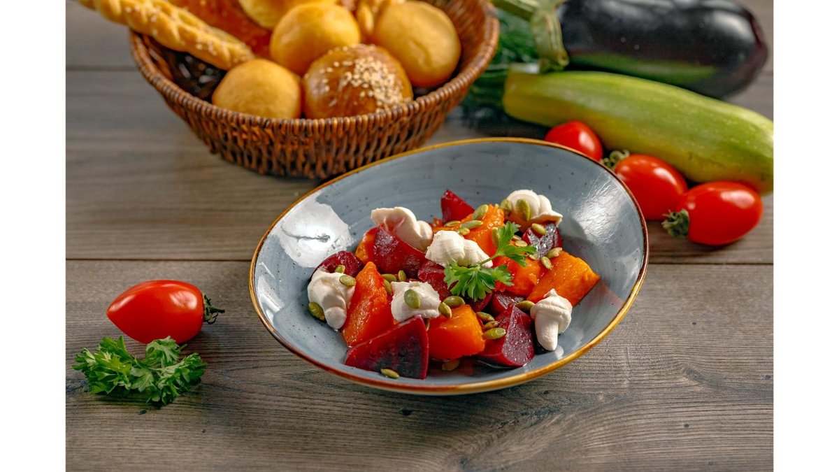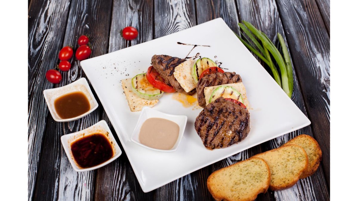 Вырезка говядины, кабачок, помидор, брынза, соус деми-глас