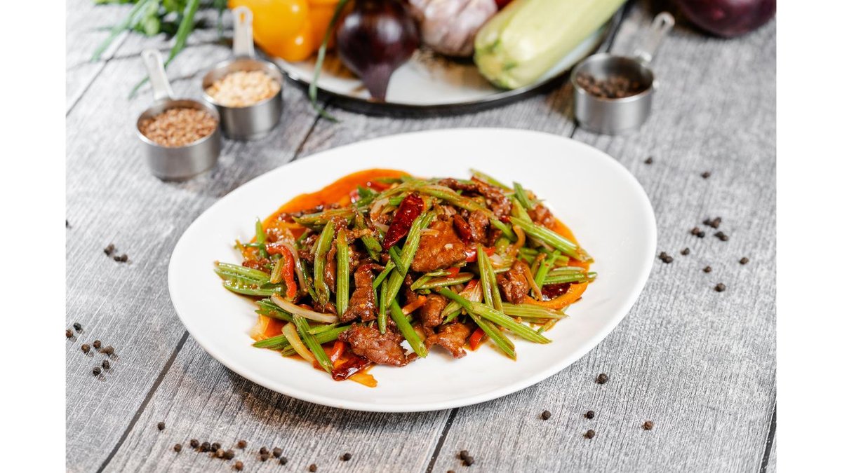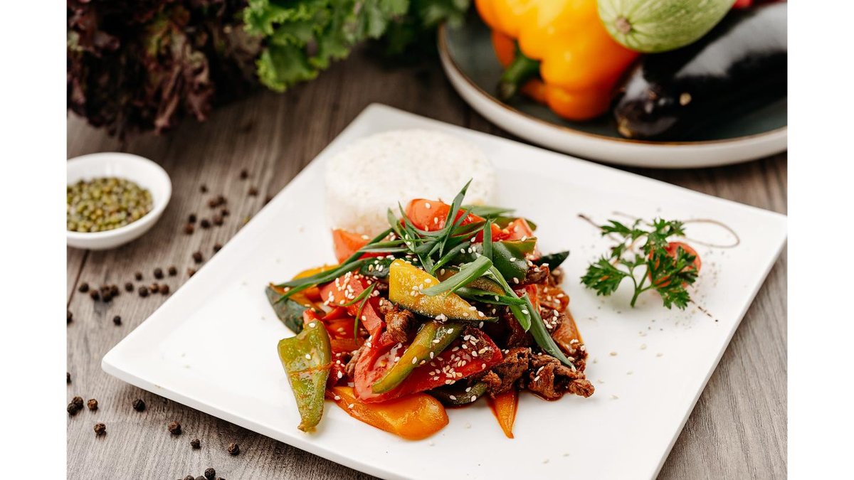 Жареный лагман: говядина, кабачок, полугорький перец, бәсәй, сельдерей
