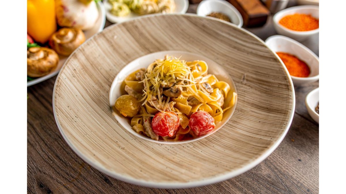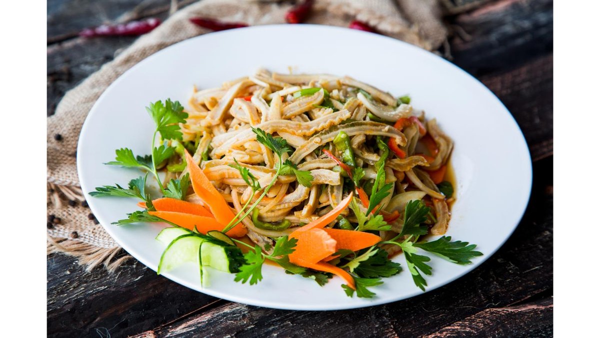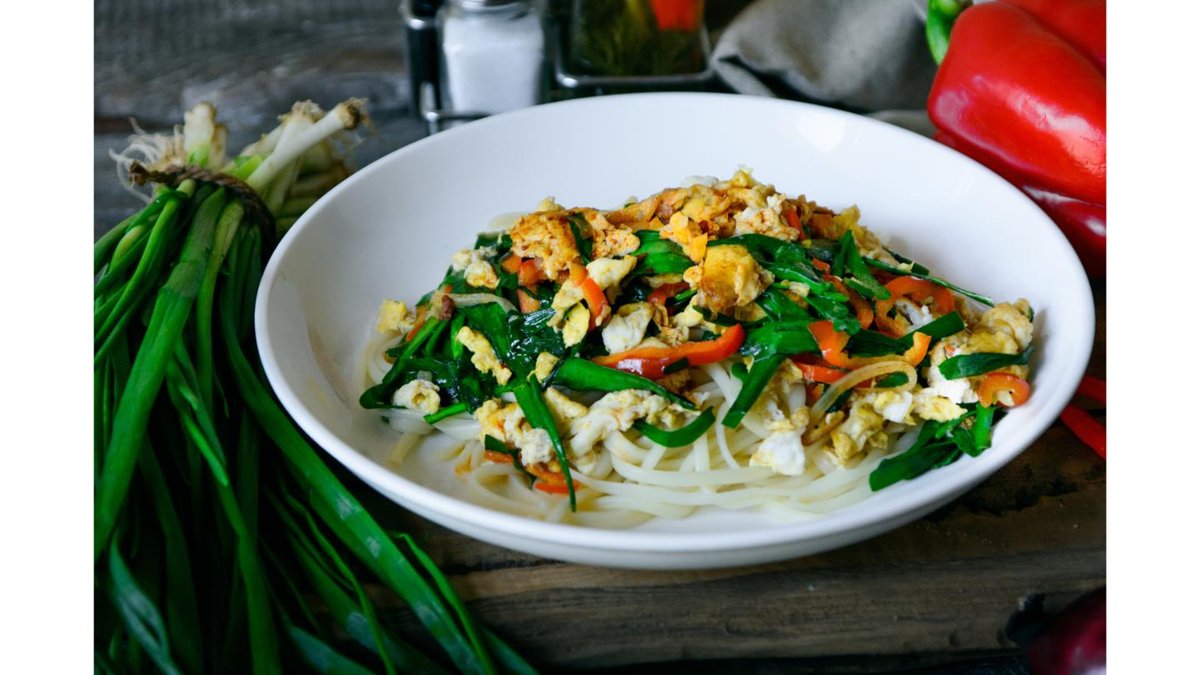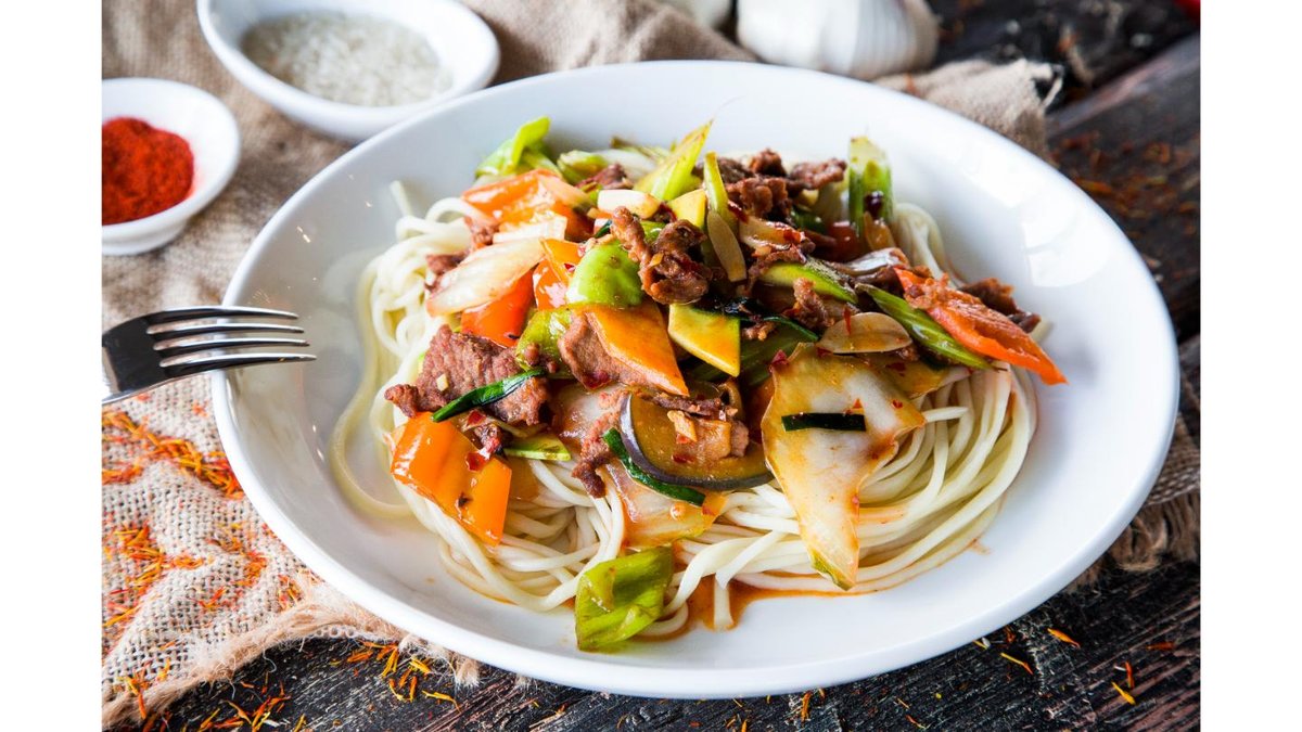 Жареный лагман с мелко нарезанными овощами: кабачок, бәсәй, полугорький перец, сельдерей