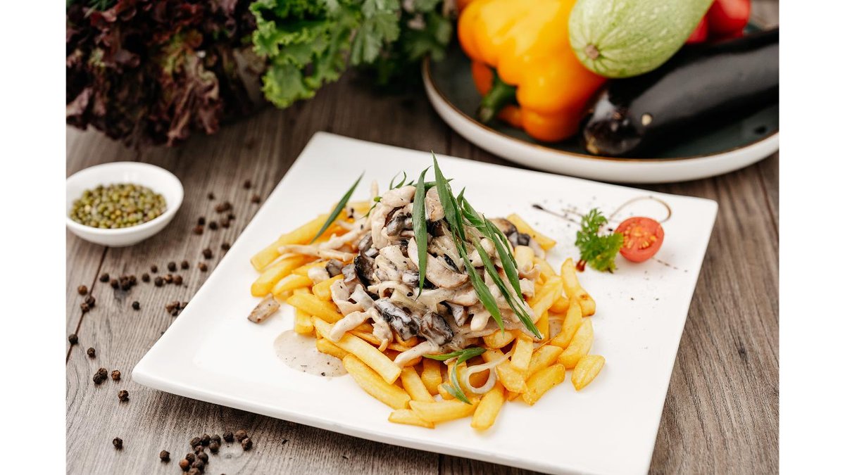 Говядина, картофель фри, перец полугорький, лук