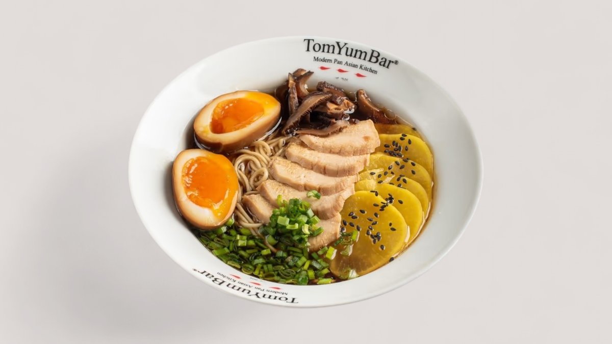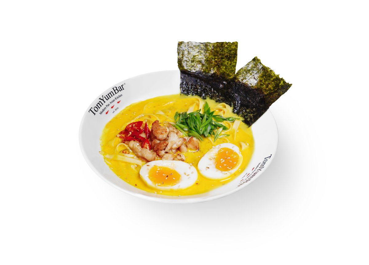 Классический японский рамэн с лапшой собственного производства. Подаётся с нежной куриной грудкой, грибами шиитаке, маринованным яйцом, зелёным луком и хрустящим такуаном