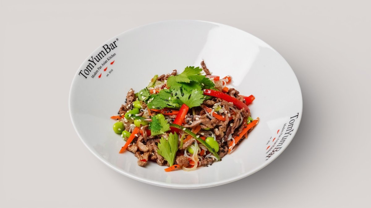 Премиальная говядина с фунчозой, огурцом и морковью с оригинальной соевой заправкой. Украшается кунжутом и кинзой