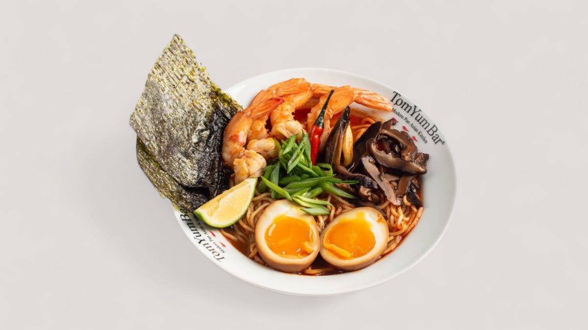 Рамэн с приятными нотками ТомЯма꞉ слегка острый бульон, фирменная лапша, королевские креветки, мидия в створке, шиитаке и маринованное яйцо. Украшается зелёным луком, лаймом и листьями нори