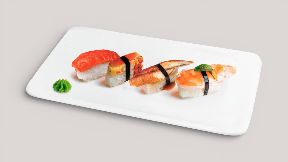 суши с креветкой, суши с лососем, суши с угрем, суши с тамаго