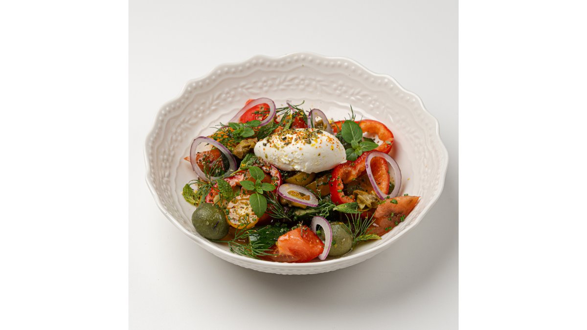 Обжаренные на углях баклажаны, смешанные с греческим йогуртом, тахини, лимонной ноткой, мятой и гранатом