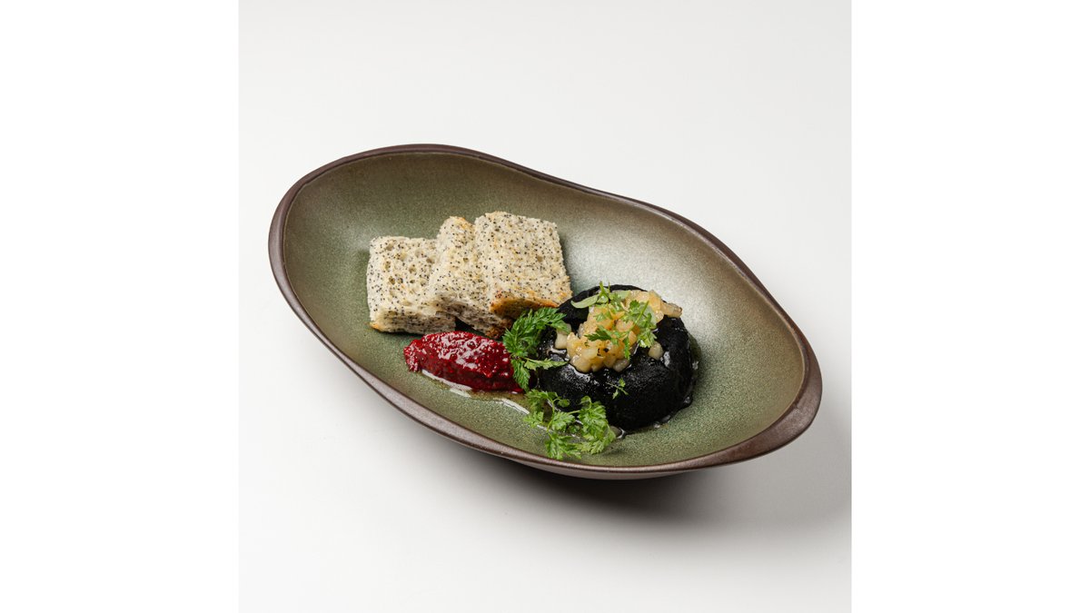 Маковая обжаренная бриошь с авокадо, лососем гравлакс, старчателлой, красной икрой, кервелем и амарантом