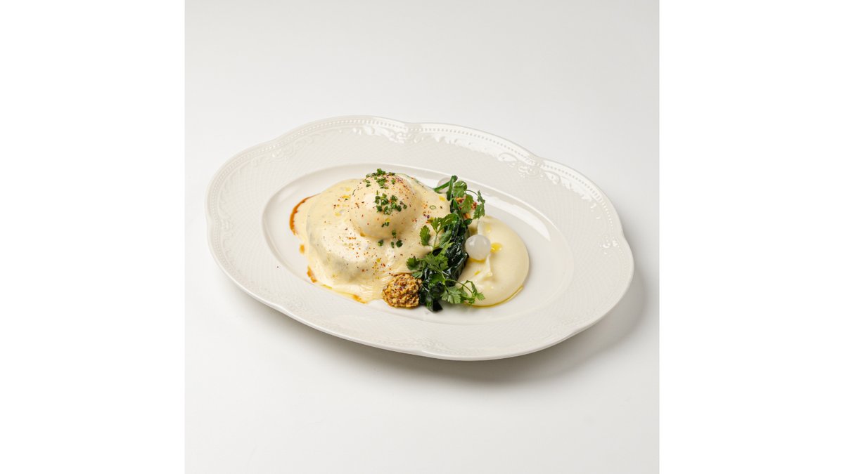 Обжаренная котлета, подается с картофельным пюре, обжаренным шпинатом и яйцом с соусами вафу и голландез