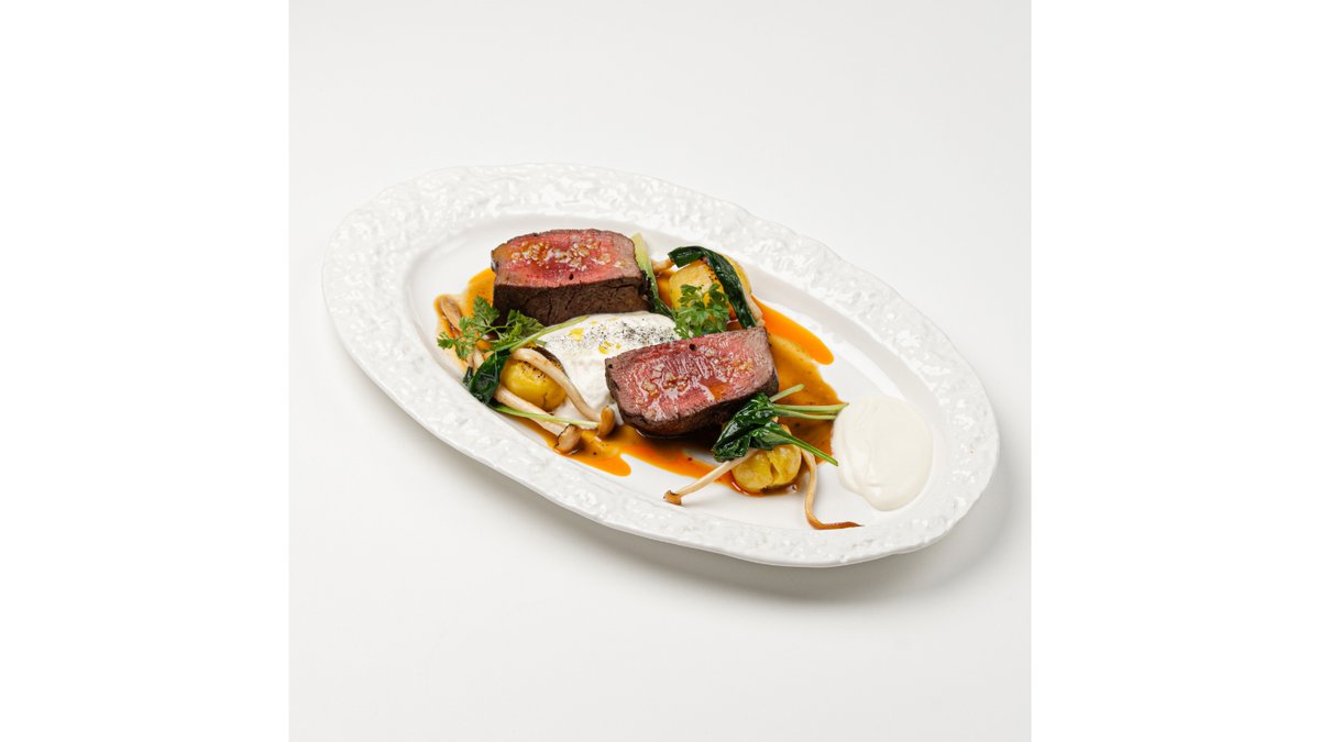 Обжаренная на гриле вырезка конины, подается с обжаренным шпинатом, зеленым луком, шимиджи, картофелем конфи и муссом из пармезана