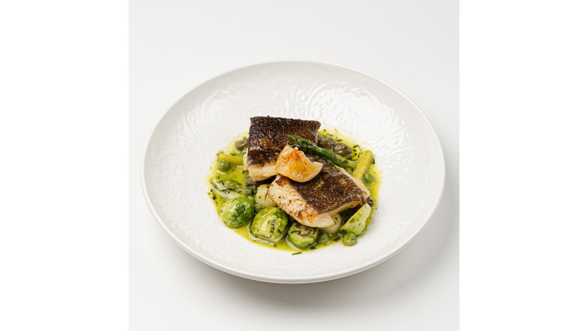 Запеченный в хоспере сибас, подается с лечо, обжаренным бэйби шпинатом, жемчужным луком и долькой лимона
