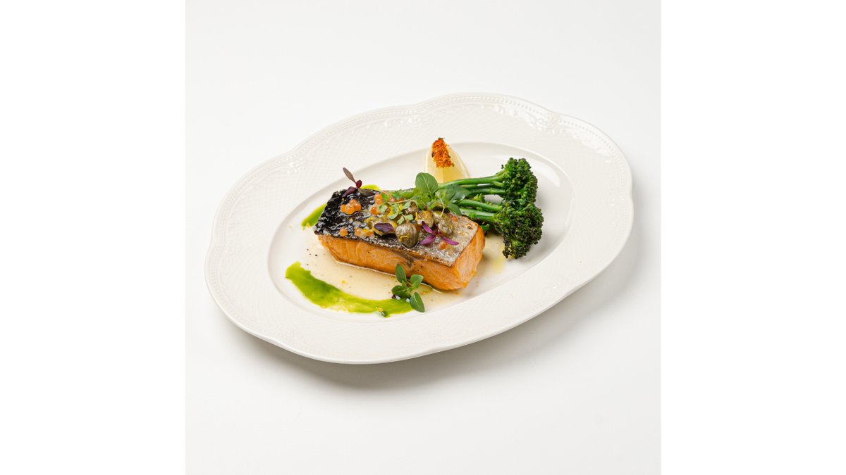 Обжаренный на гриле лосось, подается с с икорным соусом и обжаренным брокколини