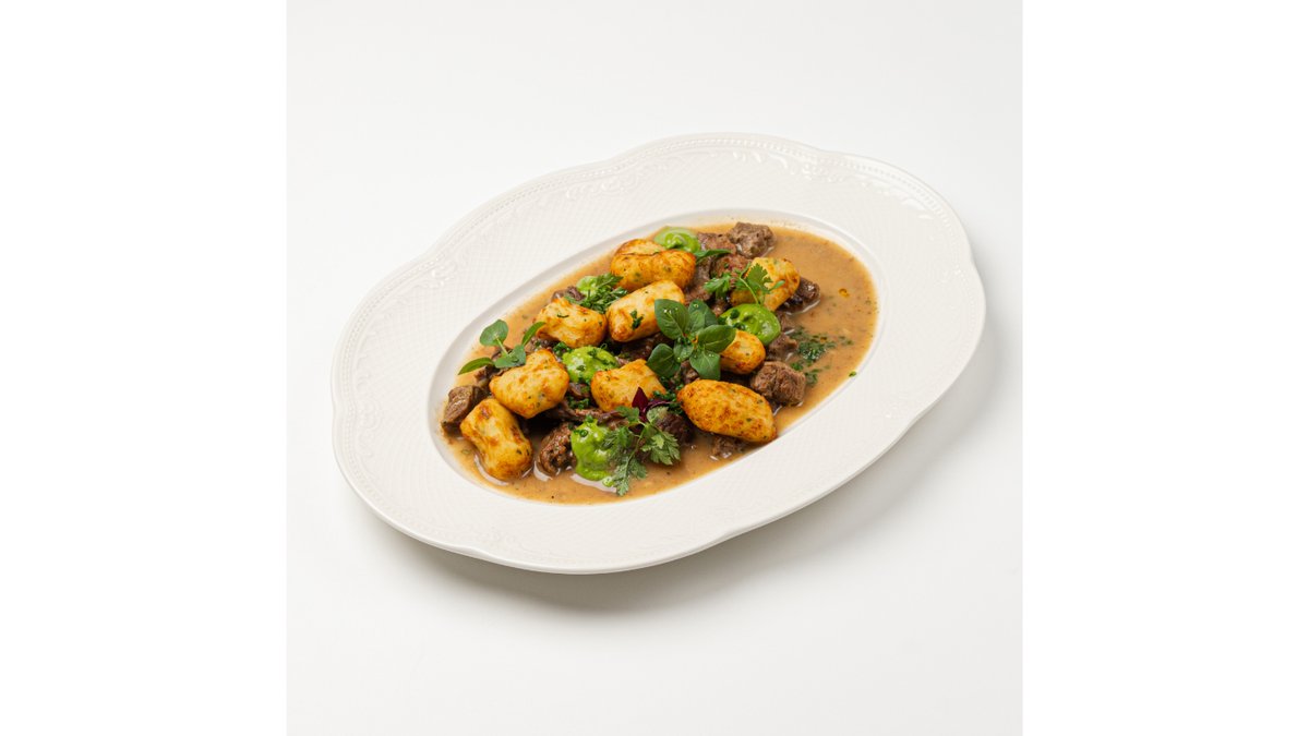 Куырдак, подается с картофельными ньокки, соусом из джусая и зеленым луком