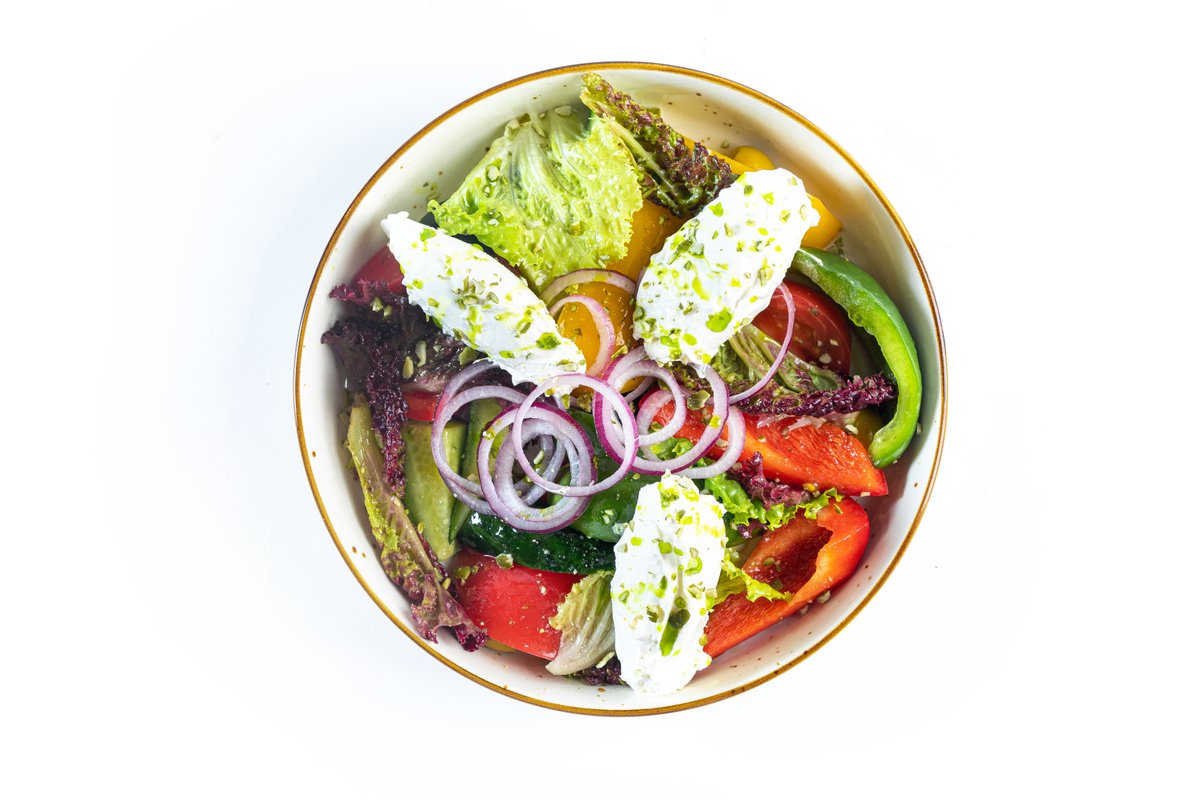 Томаты, огурец, болгарский перец, творожный сыр, красный лук, оливки и прованские травы