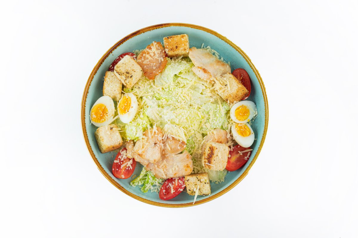 Куриная грудка, айсберг, соус цезарь, томаты черри, крутоны, перепелиные яйца и пармезан