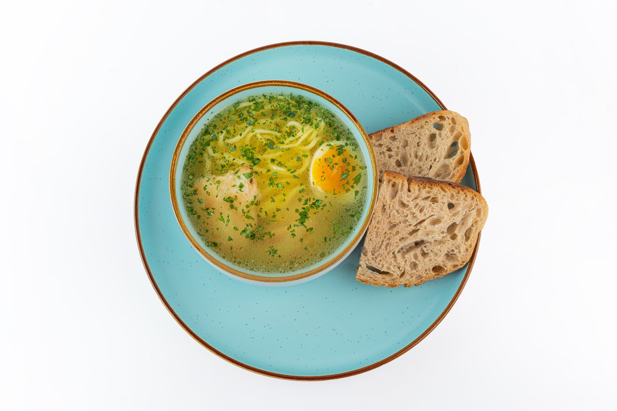 Острый бульон с курицей, лапшой, яйцом, шампиньонами, томатами черри и зеленым луком