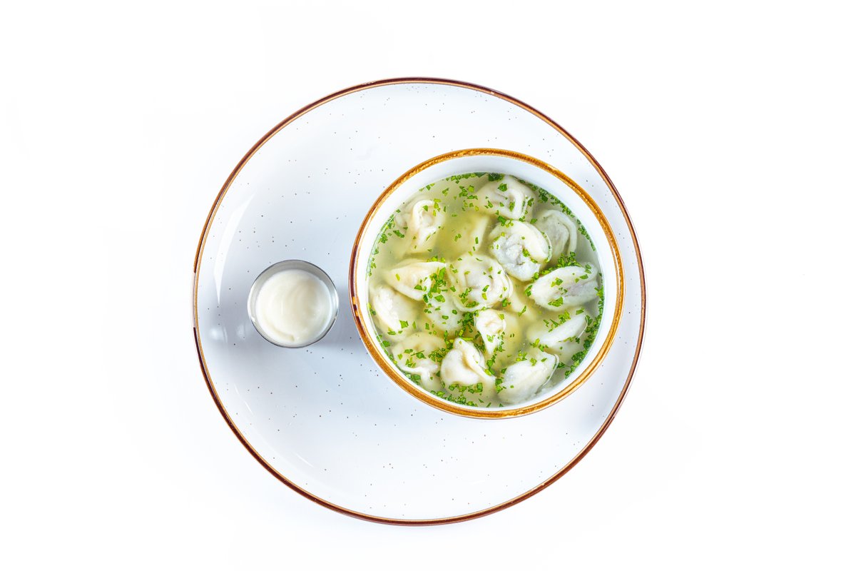 Говяжьи пельмени с бульоном, сметаной и зеленью