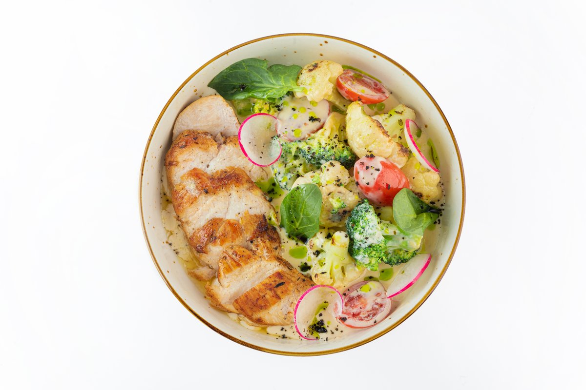 Куриная грудка в сливочном соусе с брокколи, цветной капустой, шпинатом и редисом