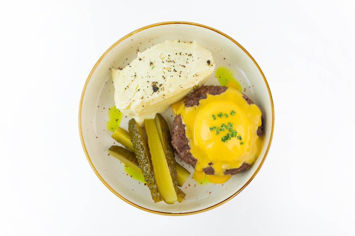 Говяжий бифштекс с яйцом пашот, голландским соусом, солеными огурцами и картофельным пюре