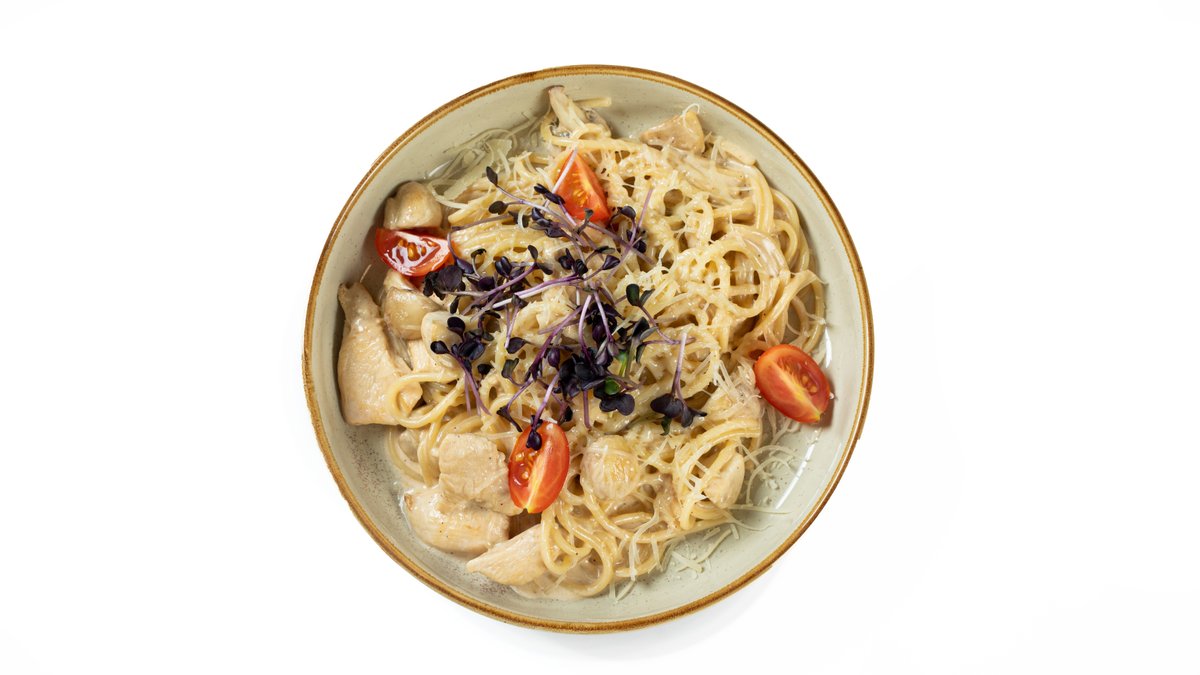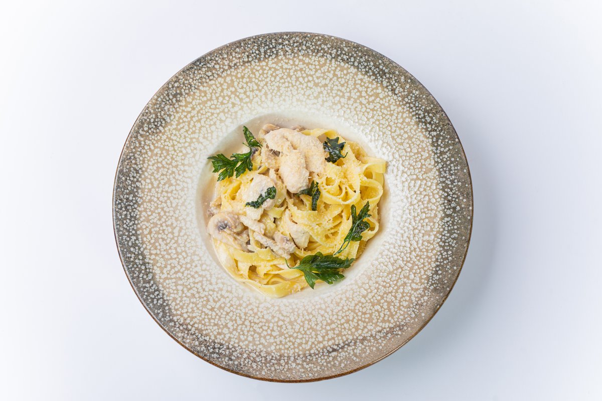 Фетучини с куриным филе, шампиньонами в сливочном соусе с зеленью и пармезаном