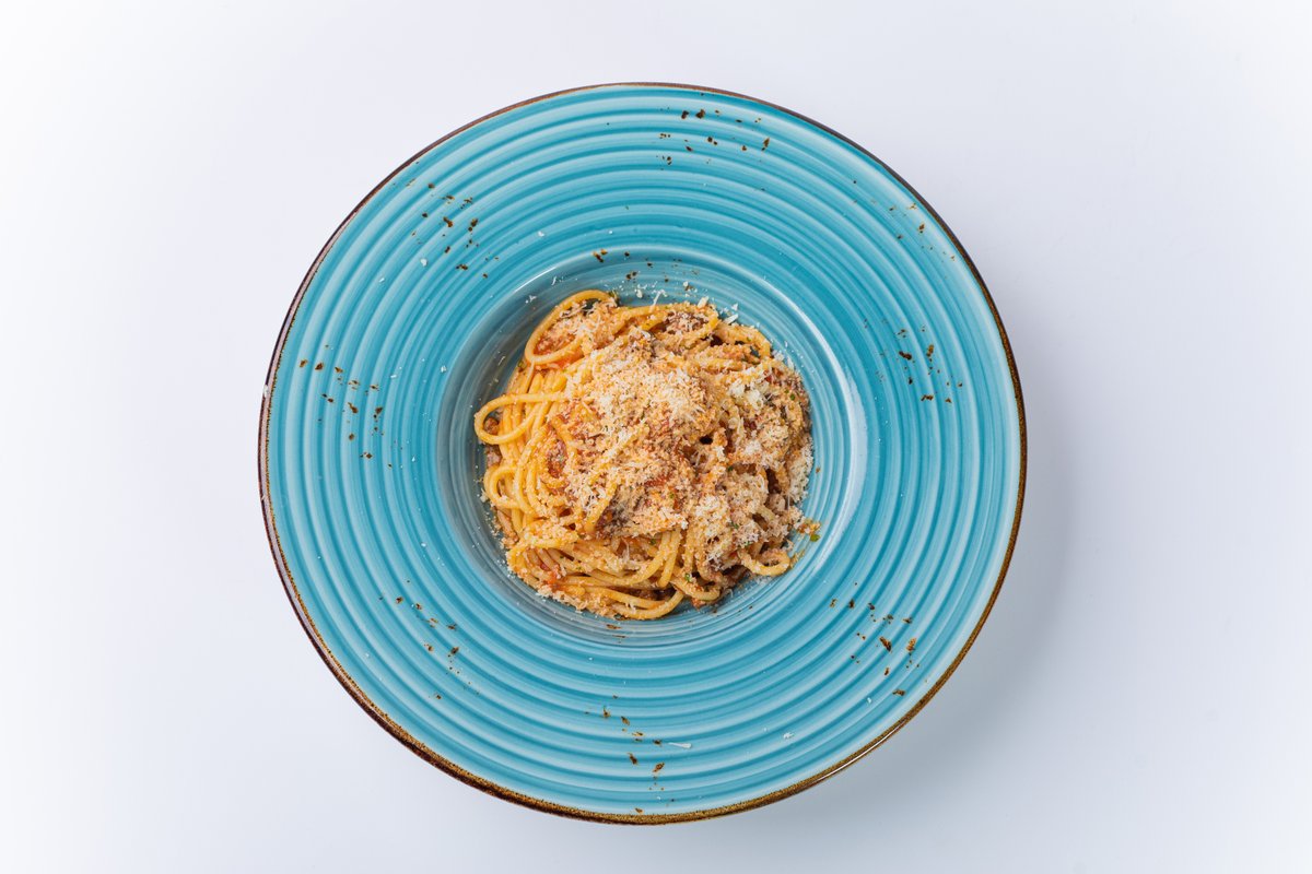 Спагетти, филе курицы, шампиньоны, помидоры черри, сыр пармезан.