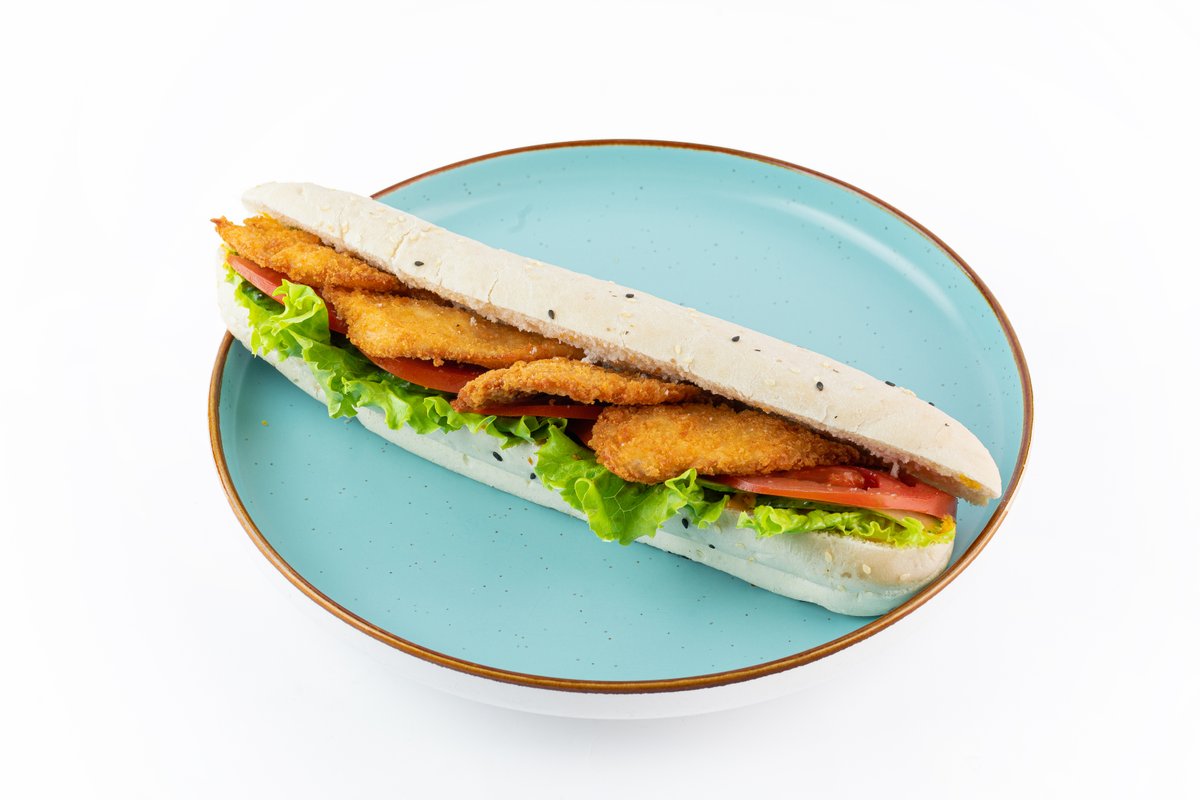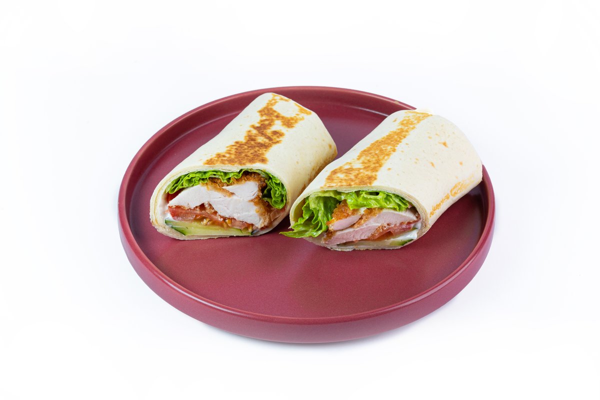 С куриной котлетой, соусом, овощами, чеддером и айсбергом