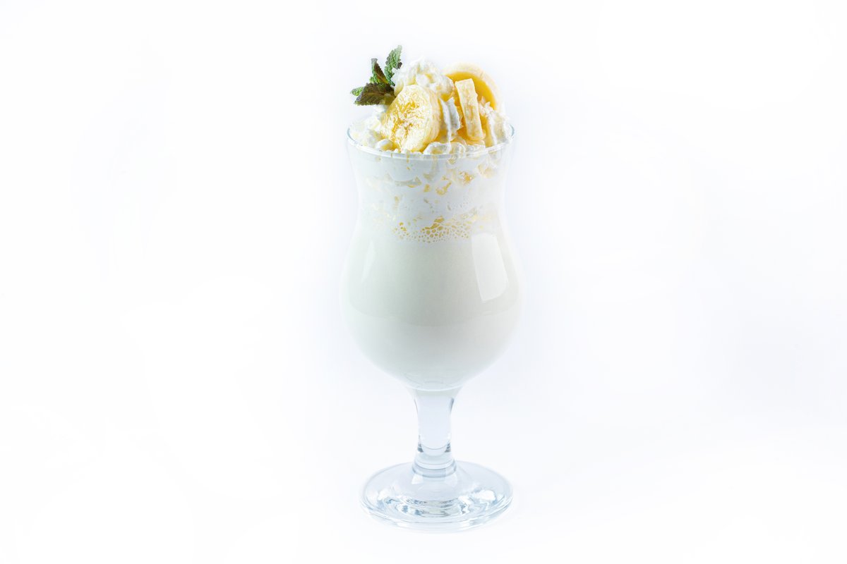 Охлажденный коктейль на молочной основе, с добавлением ванильного порошка, свежего банана и льда. Украшается взбитыми сливками, слайсами банана. Объемы 0.4