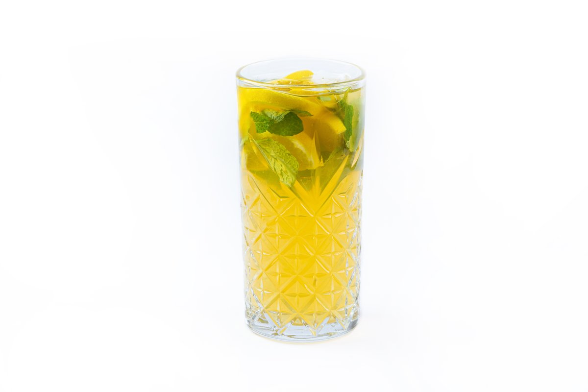 Холодный чай с добавлением свежей мяты, лимонного сока и сахара. Украшается долькой лимона. Объемы 0.4