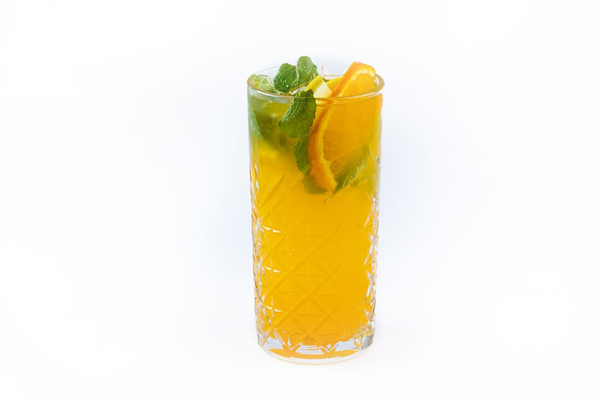 Лимонад на основе газированной воды, с добавлением пюре из манго, пюре маракуйя и лимонного сока. Украшается дольками апельсина и веточками мяты. Объемы 0.4
