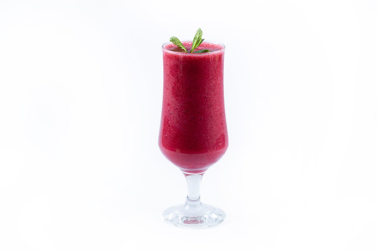 Смузи на основе яблочного фреша, с добавлением ягоды смородины, банана, льда и сахара. Украшается веточкой мяты. Обьемы 0.4