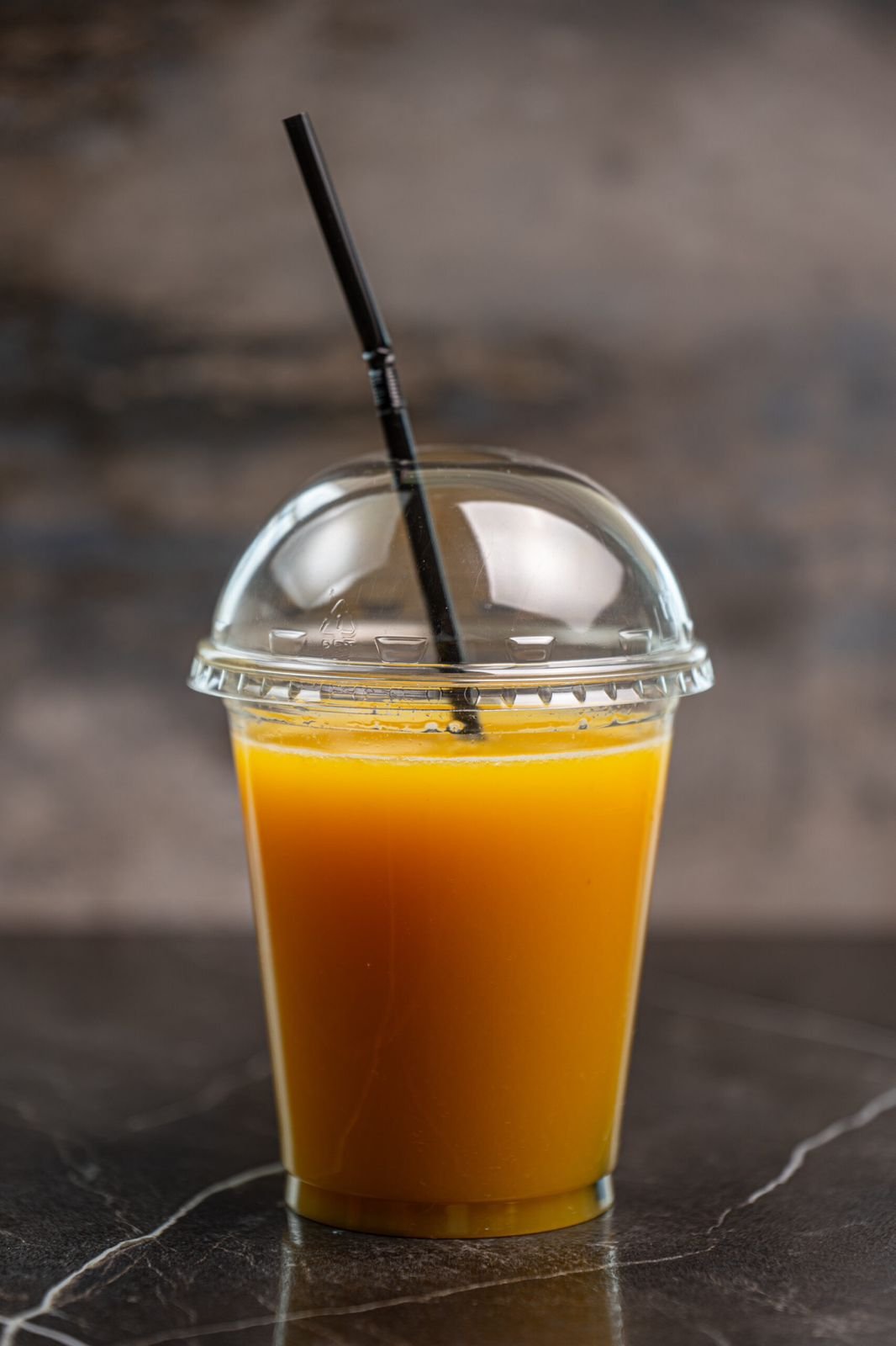 Смузи на основе апельсинового фреша, с добавлением свежего банана и ягоды клубники. Украшается веточкой мяты. Обьем 0.4