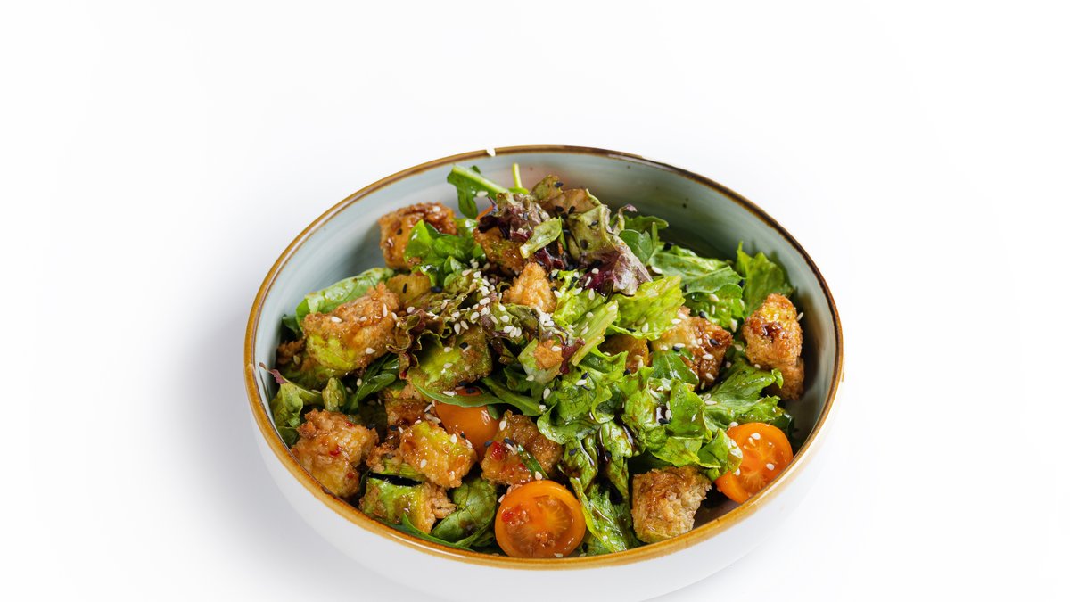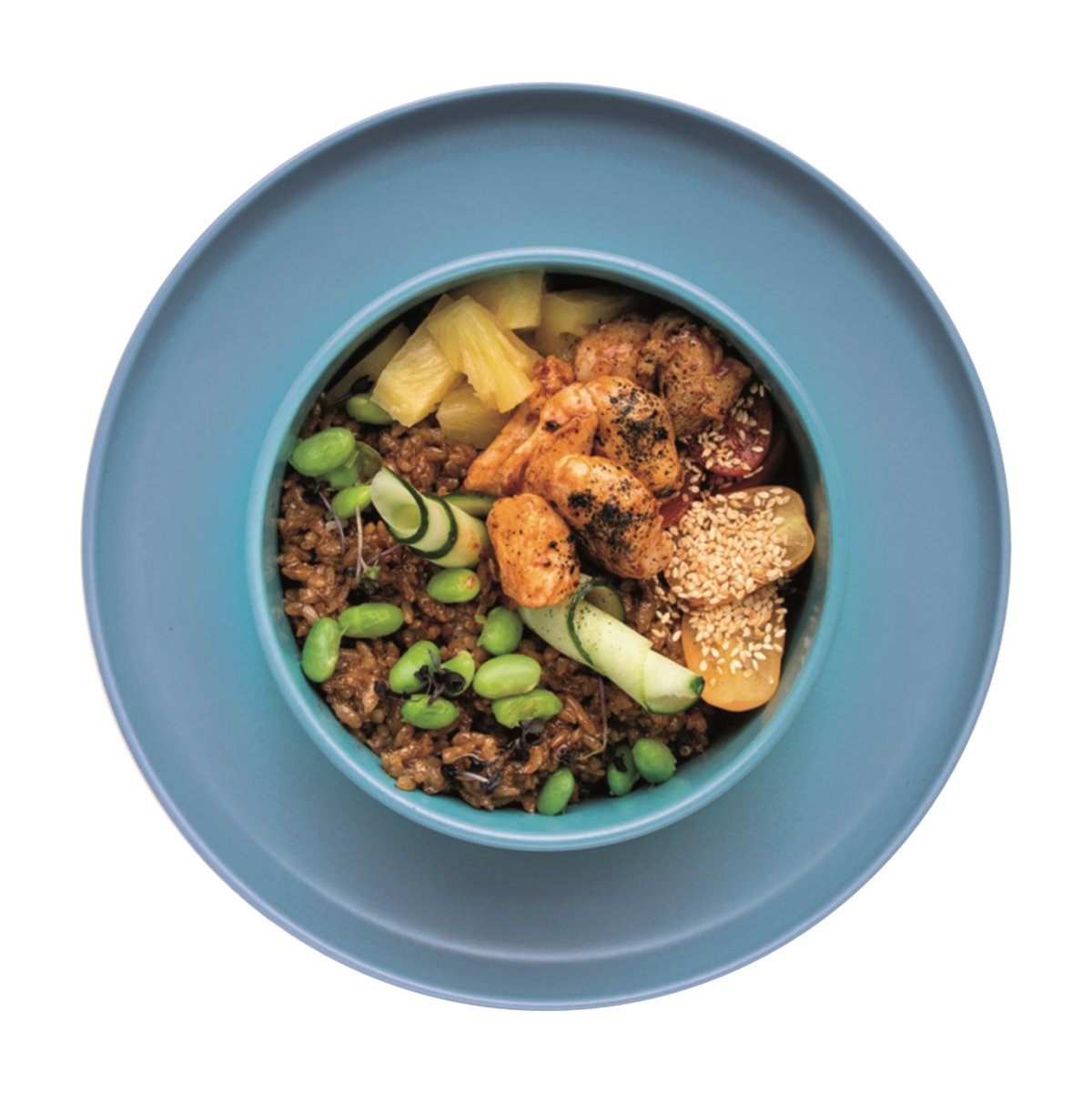 Блюдо гавайской кухни из подушки риса, филе курицы, ломтиков ананаса, бобов эдамаме, помидоров черри, огурцов, заправленный ореховым и соевым соусом.