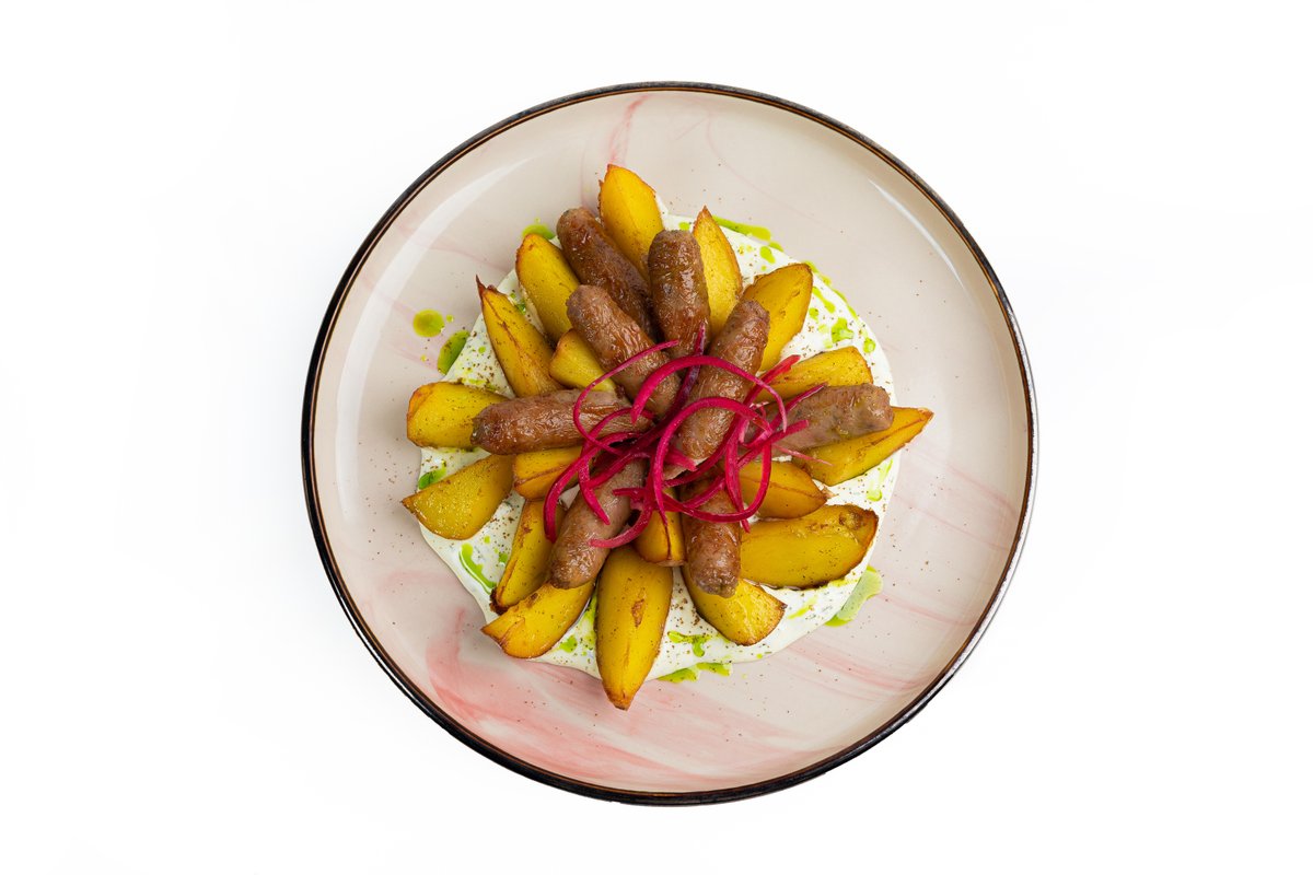 Говяжьи колбаски, запеченный картофель, соус тар-тар.