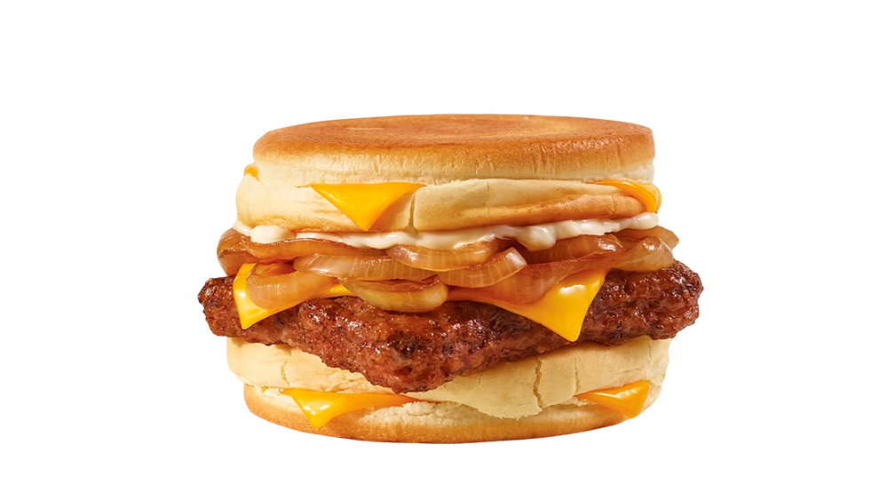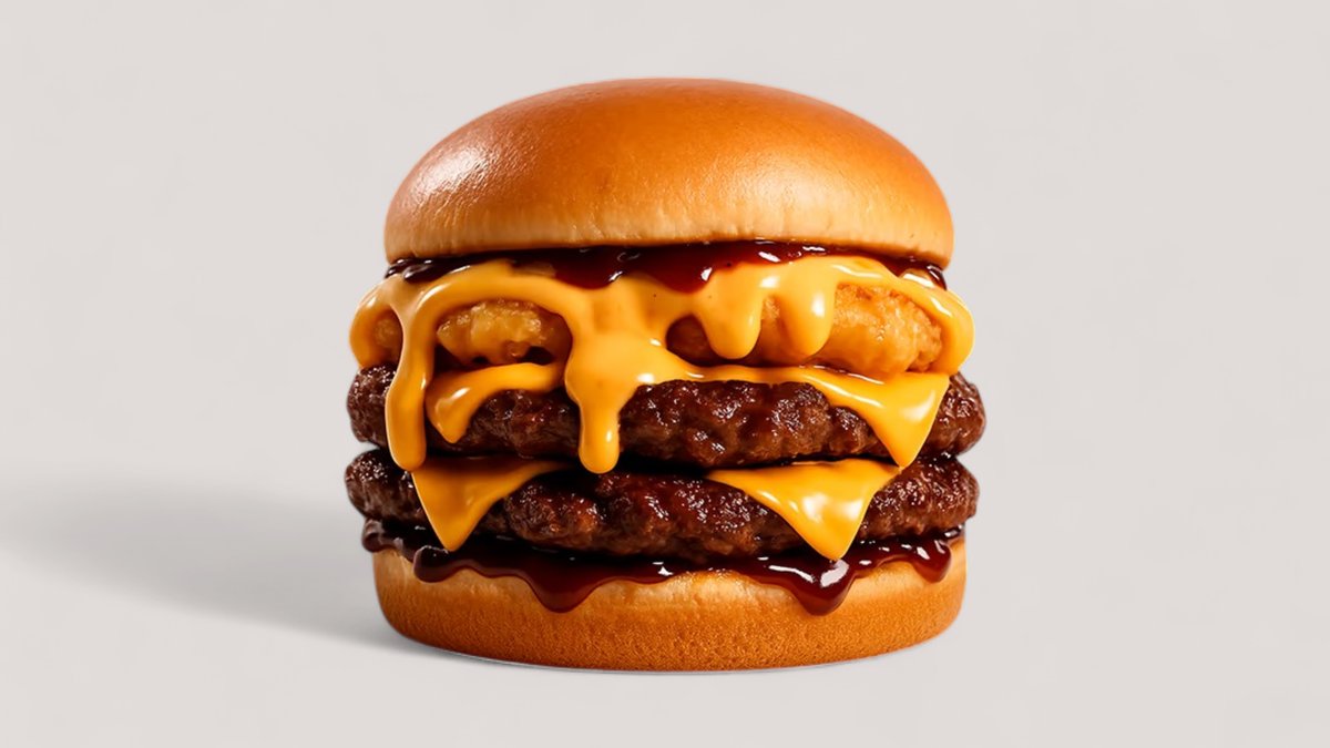 Мягкая булочка, двойная большая фирменная говяжья котлета Wendys, луковые кольца, сыр чеддер, соус барбекю