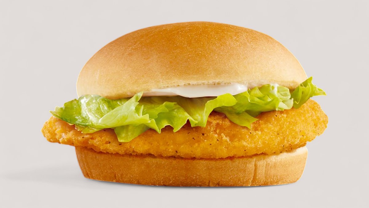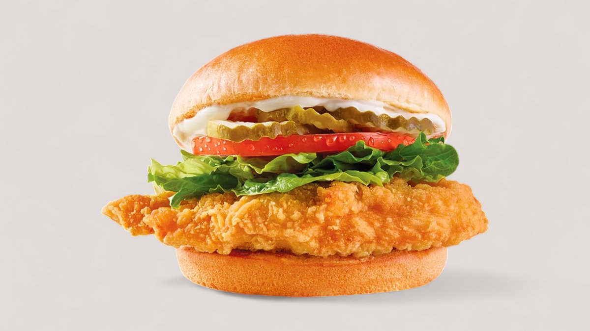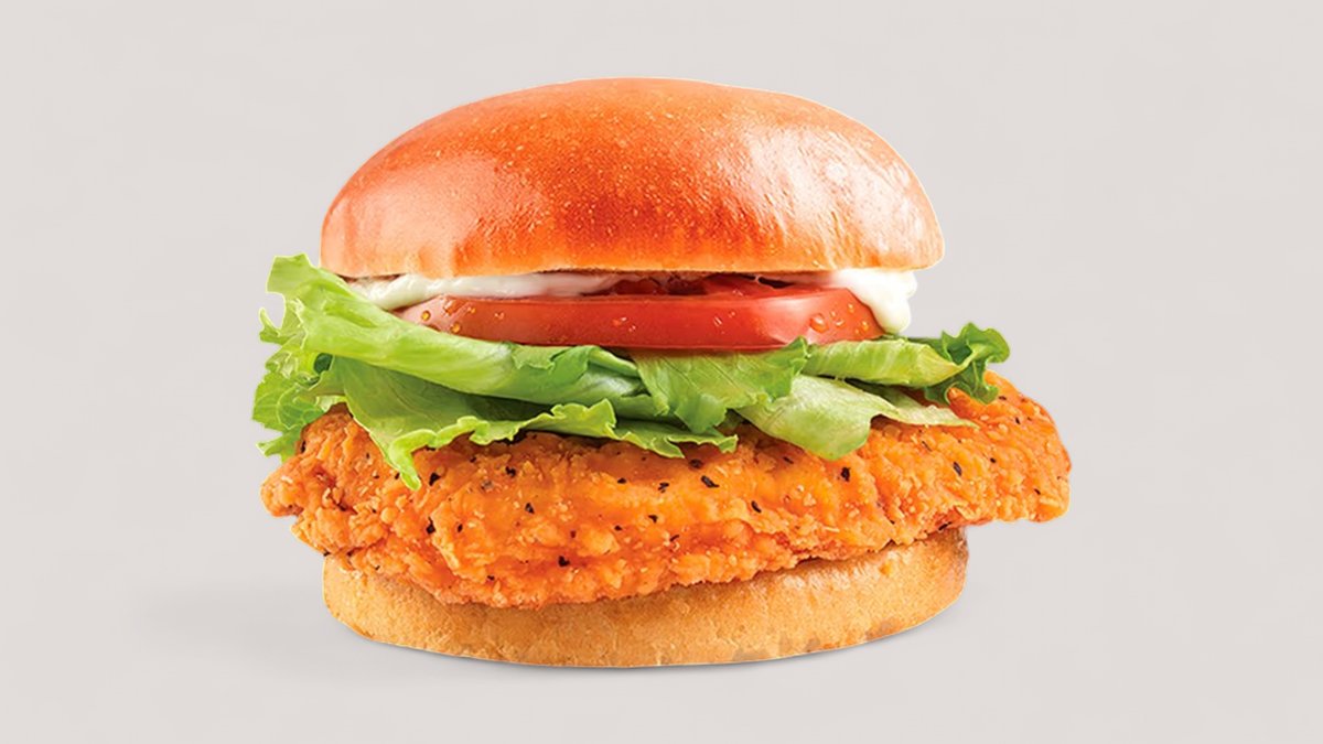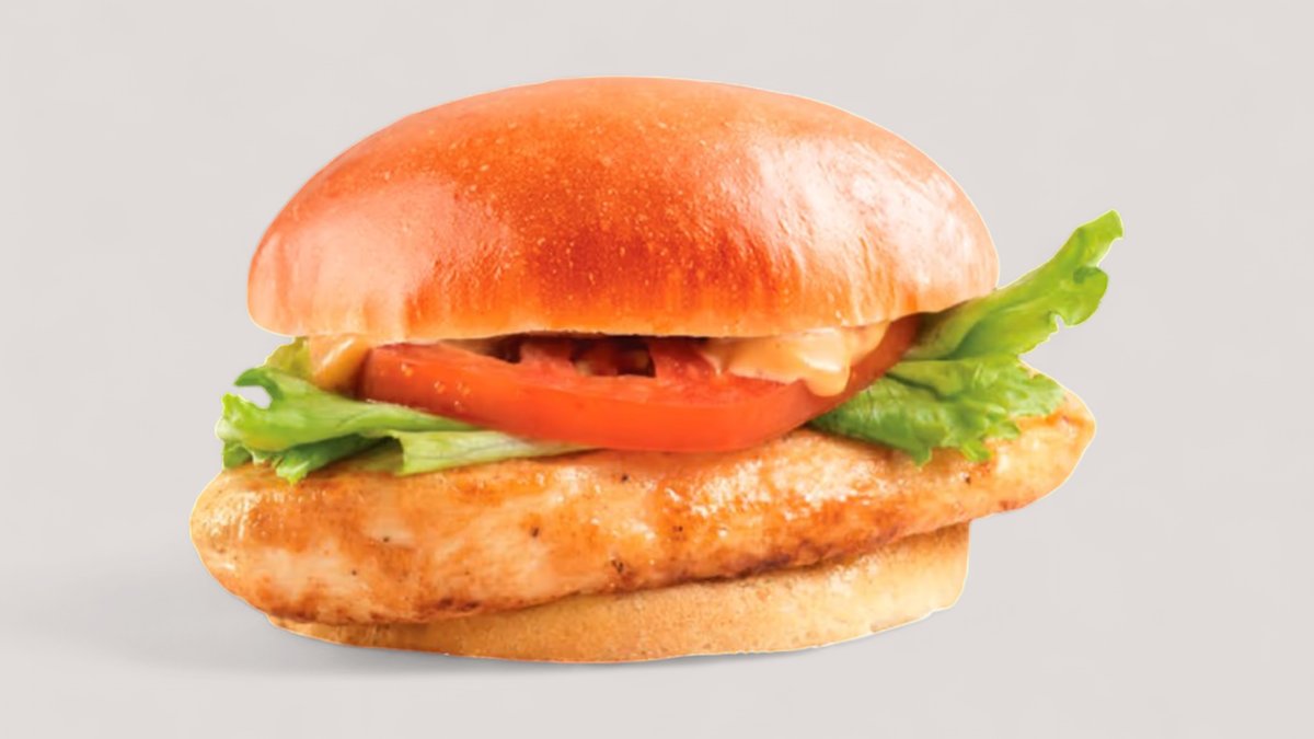Мягкая булочка, острое куриное филе, ломтик спелого помидора, листья салата айсберг, заправленные соусом ренч