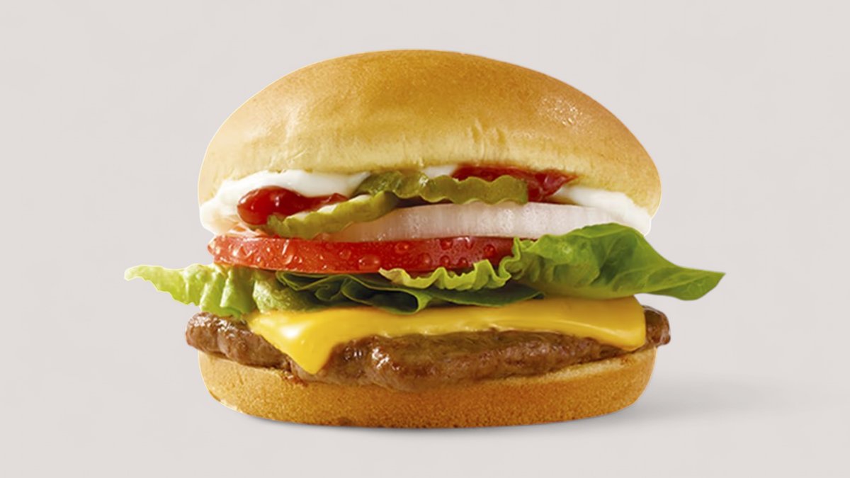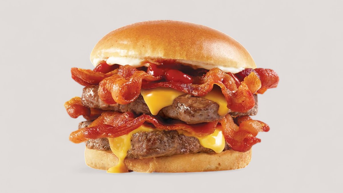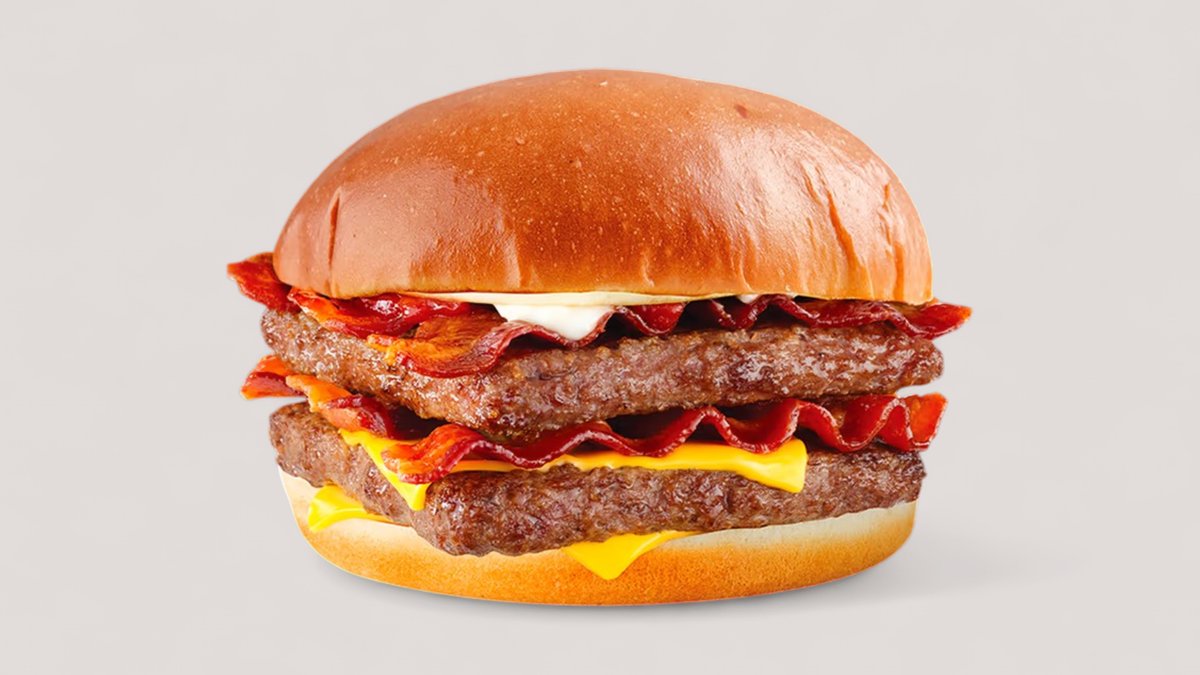 Мягкая булочка, двойная маленькая фирменная говяжья котлета Wendys, 4 кусочка говяжьего бекона, двойной сыр чеддер, майонез, кетчуп