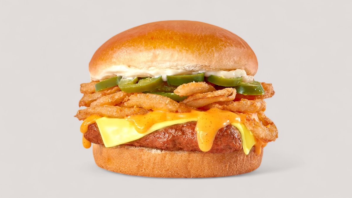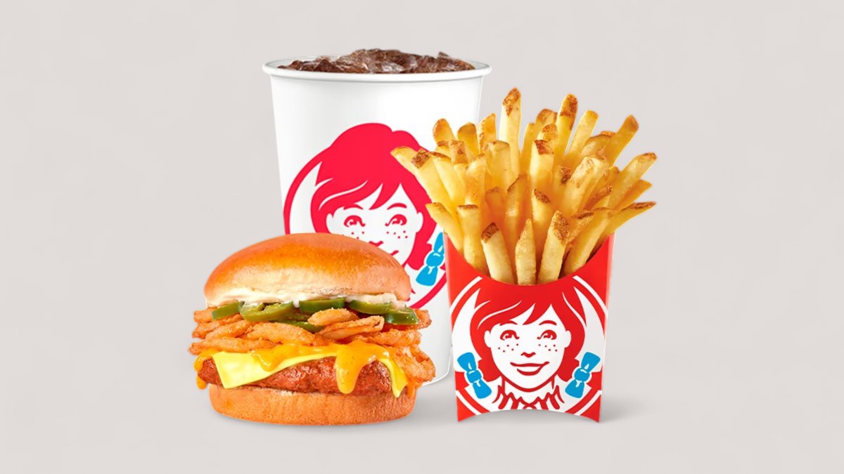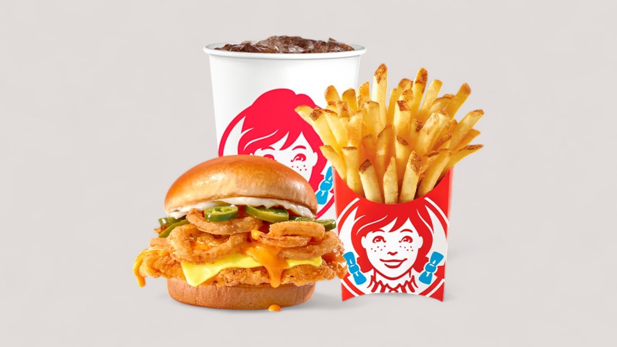 Мягкая булочка, большая фирменная говяжья котлета Wendys, луковые кольца, сыр чеддер, соус шрирача, перчики халапеньо