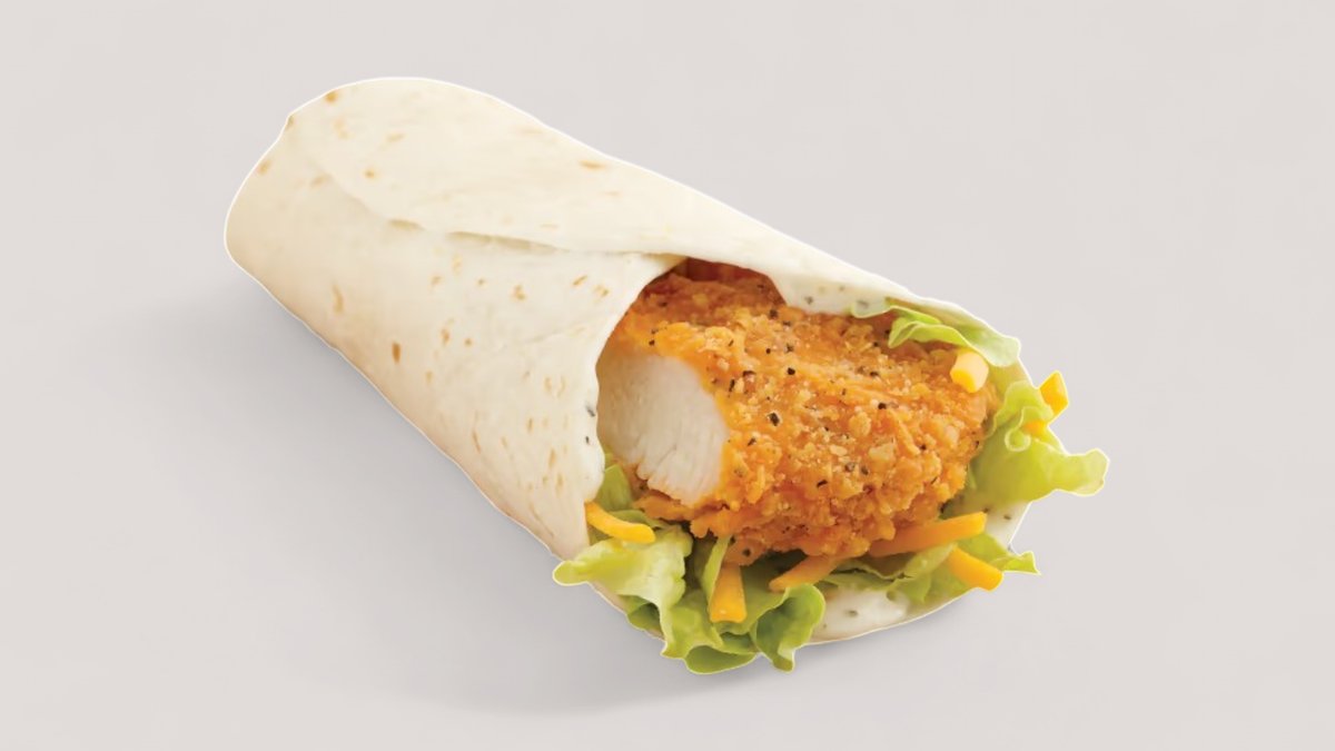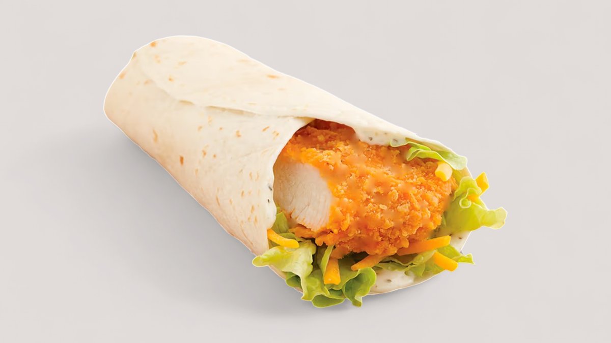 Нежное куриное филе, листья салата айсберг, помидоры, сыр чеддер, тортилья, соус рэнч