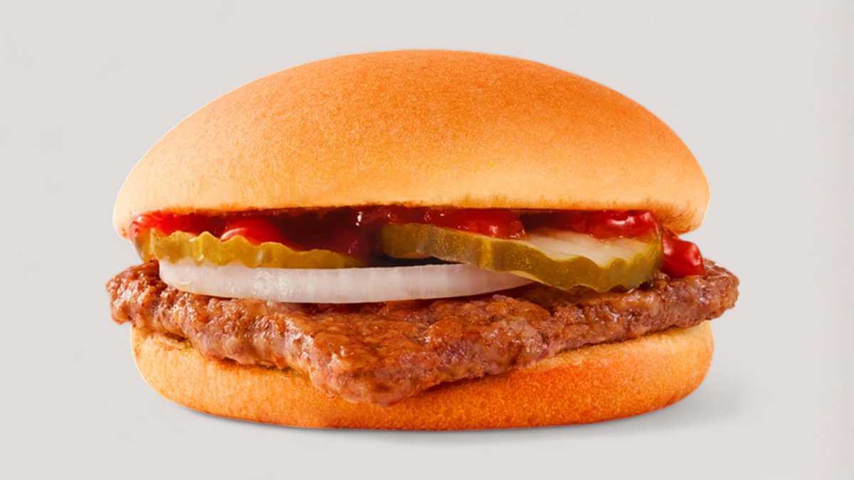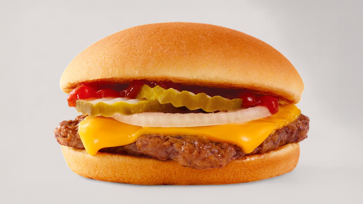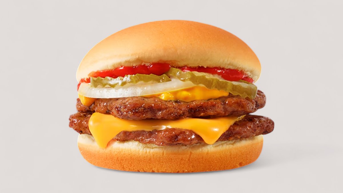 Булочка, маленькая двойная говяжья котлета, двойной сыр чеддер, кольца лука, пикули, кетчуп и горчица