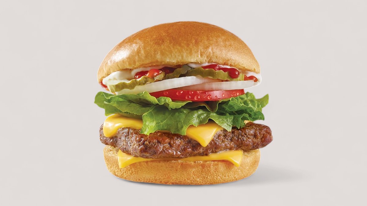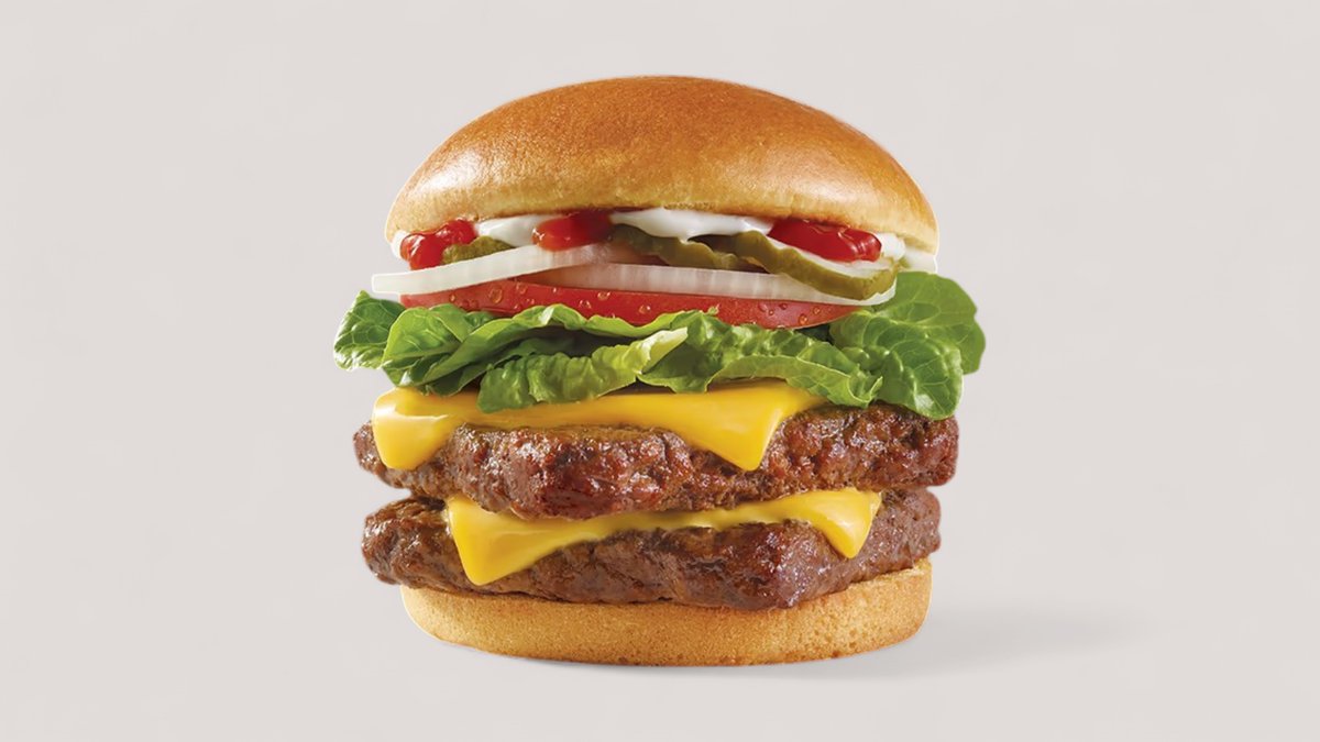 Мягкая булочка, большая двойная фирменная говяжья котлета Wendy's, двойной сыр чеддер, листья салата айсберг, кольца лука, спелые томаты, пикули, кетчуп, майонез