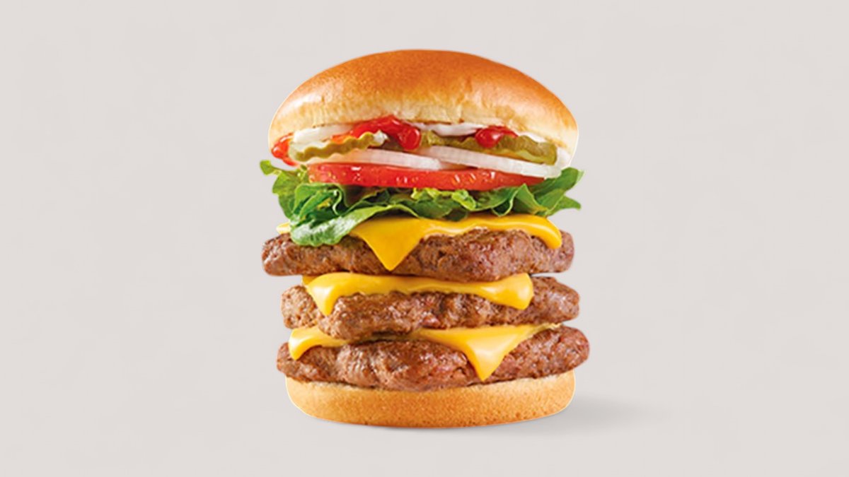 Мягкая булочка, большая тройная фирменная говяжья котлета Wendy's, тройной сыр чеддер, листья салата айсберг, кольца лука, спелые томаты, пикули, кетчуп, майонез