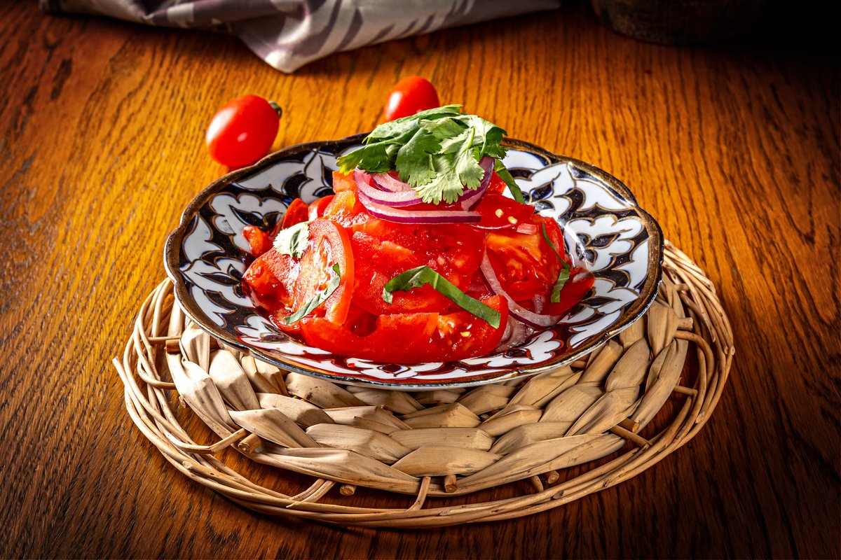 Салат из спелых розовых помидоров,лука,свежего базилика и немножко острого перца.