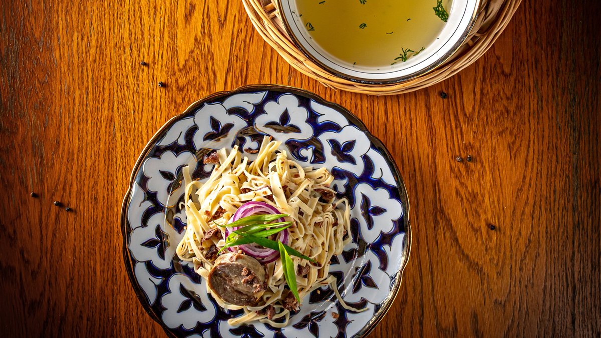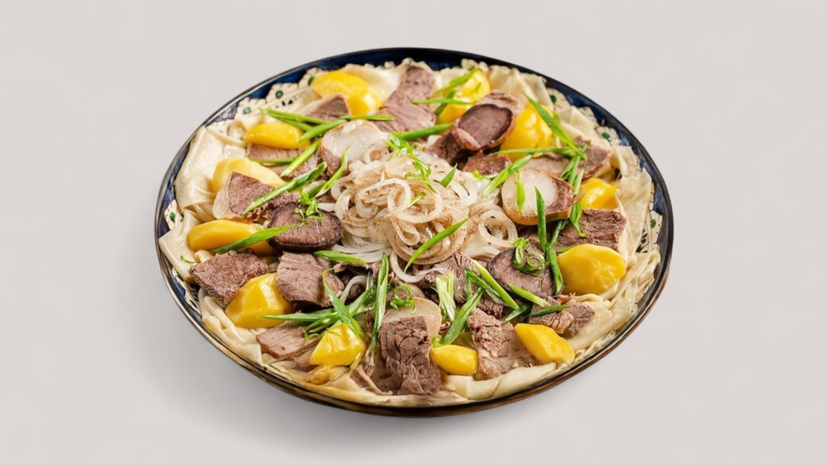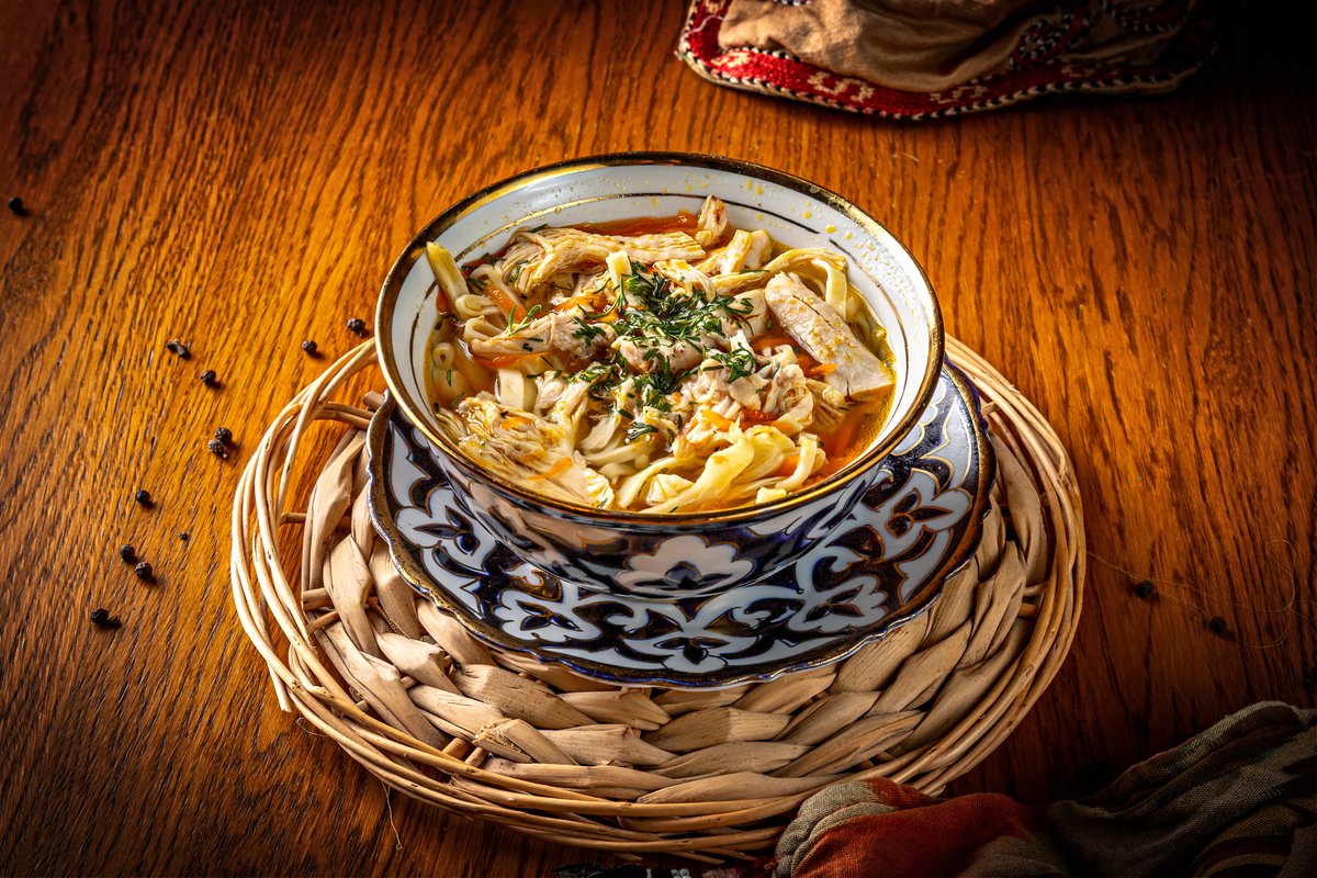 Национальное узбекское блюдо из конины,говядины,домашней лапши,лука и насыщенного бульона.