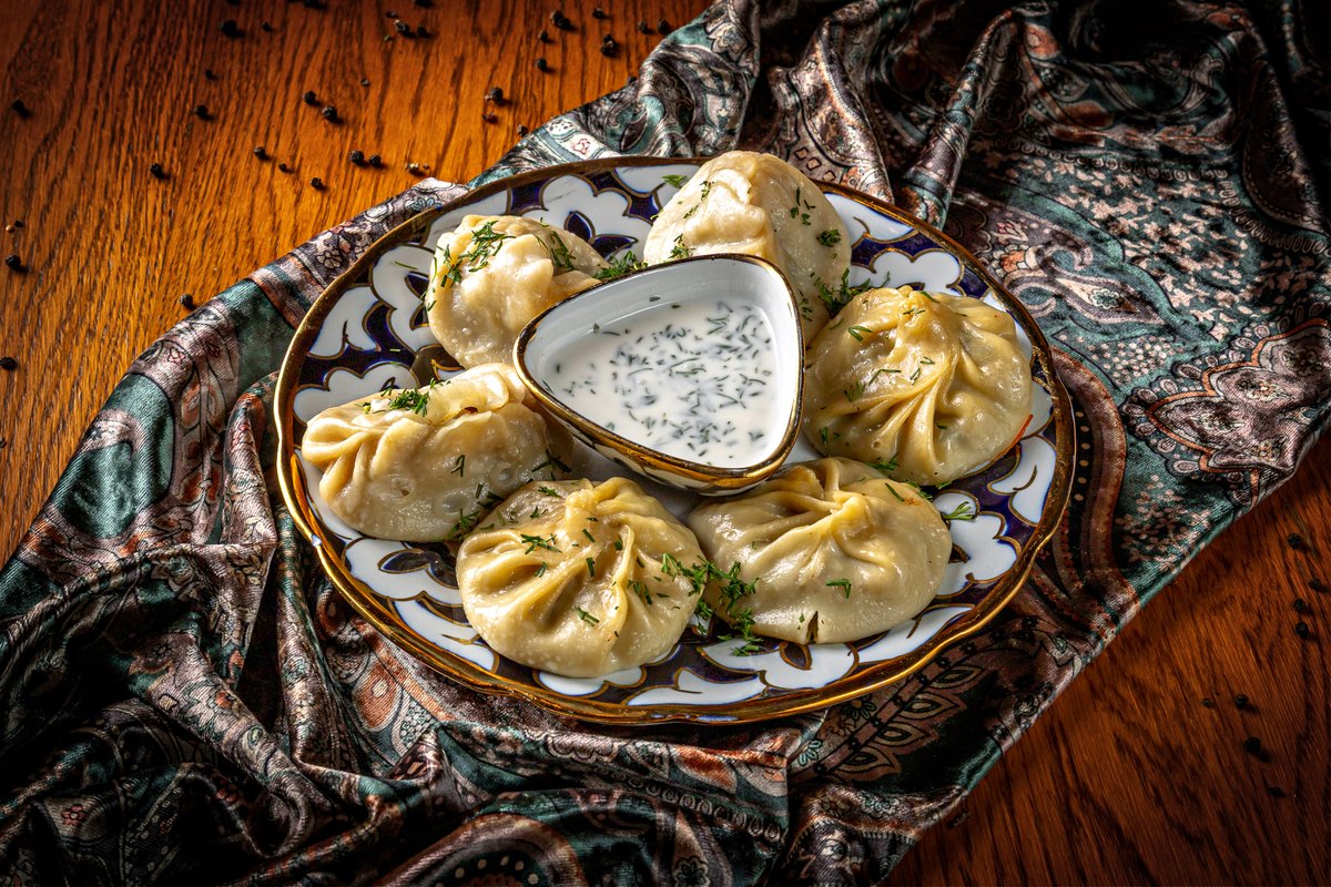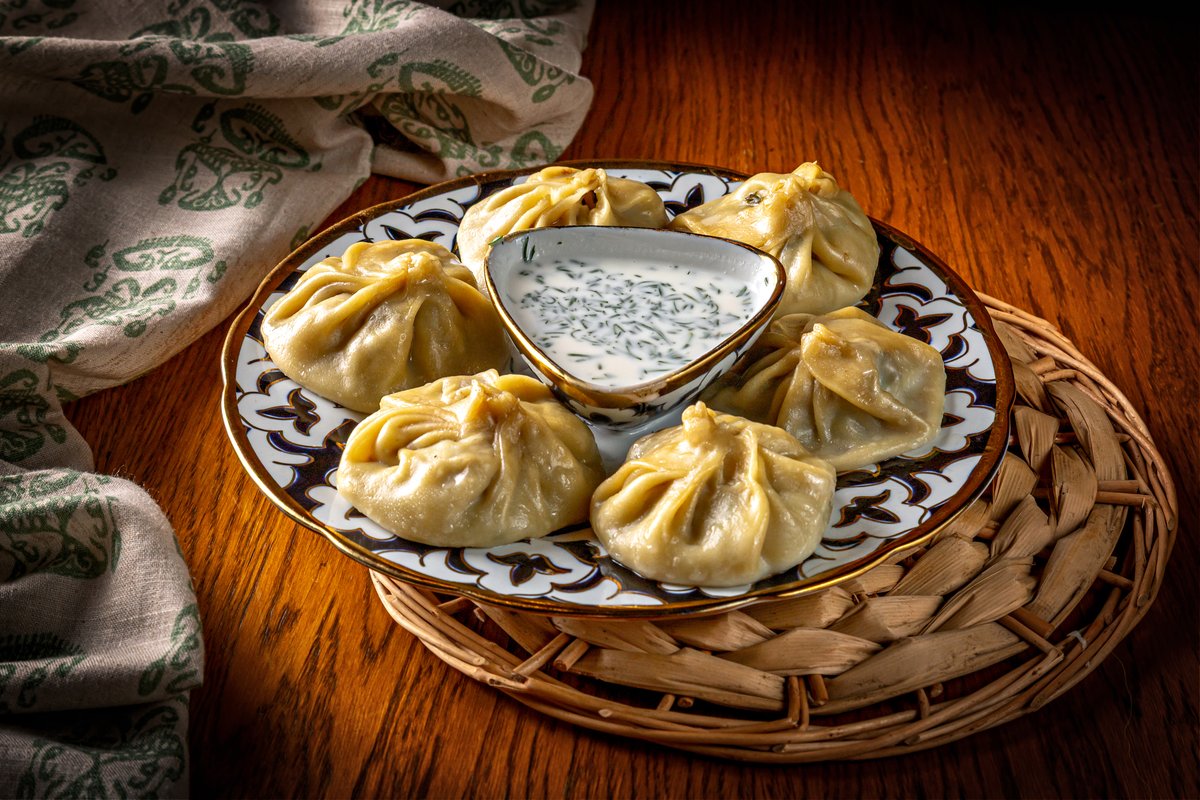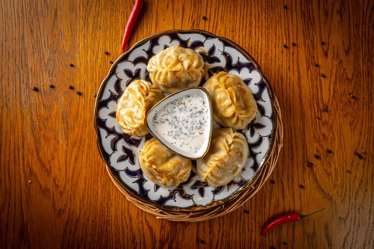 Манты из дрожевого теста с говядиной и курдюком. Подаем с кисло-острым соусом.