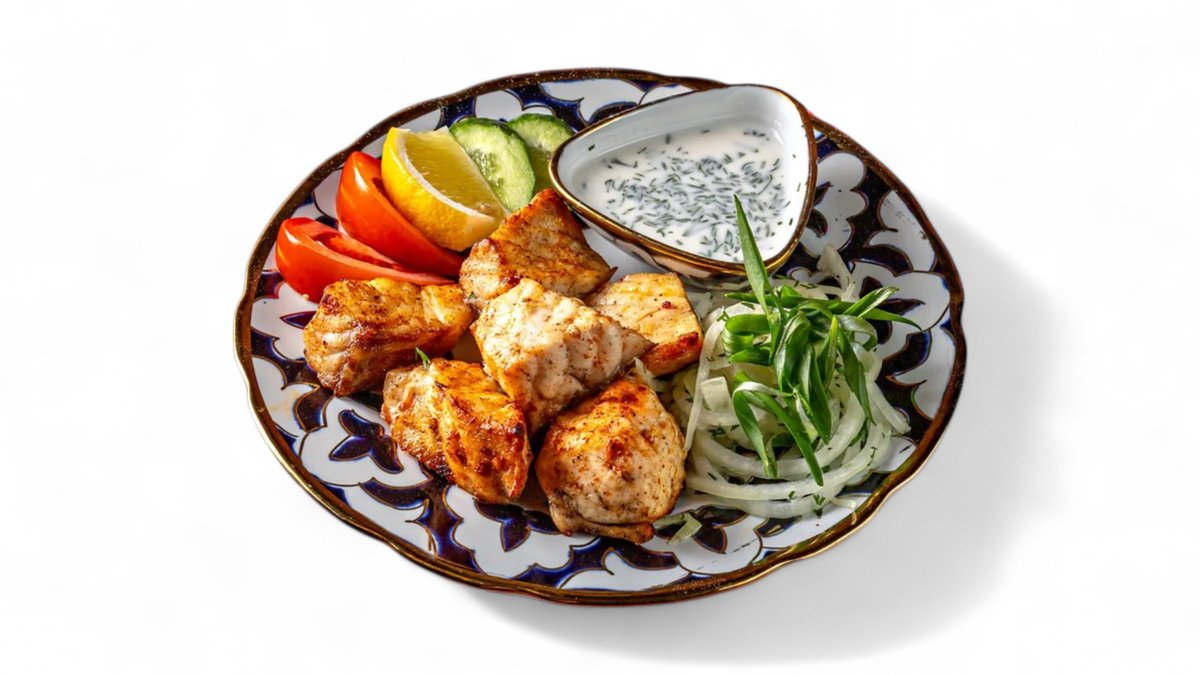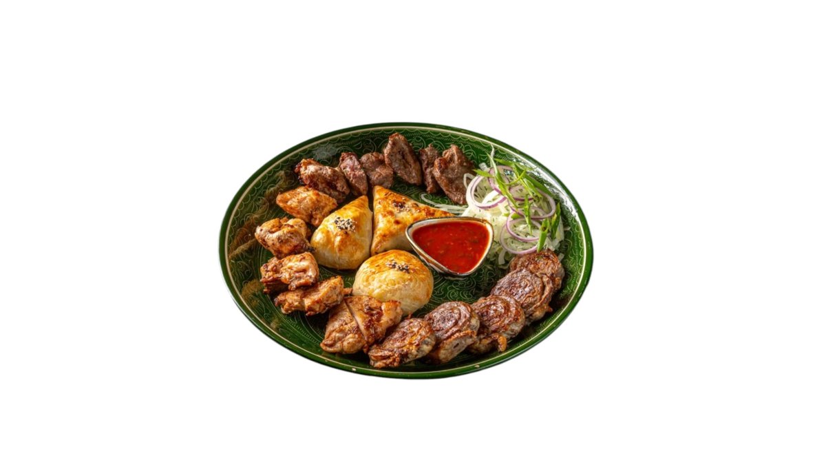 самса с мясом и самса с курицей и картофелем,самса с тыквой,шашлык из баранины,шашлык курица,рулет кебаб из говядины, на 3-4 персоны 700гр
