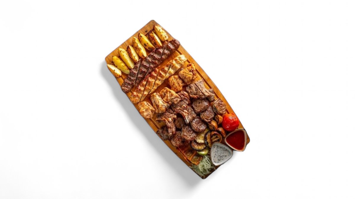 шашлык баранина,рулет кебаб из говядины,шашлык из курицы,люля баранина,люля курица,шашлык из бараньи корейки,овощи гриль,картофельные дольки,лук,маринованный баклажан,лепешка на 5-6 персон 1300гр