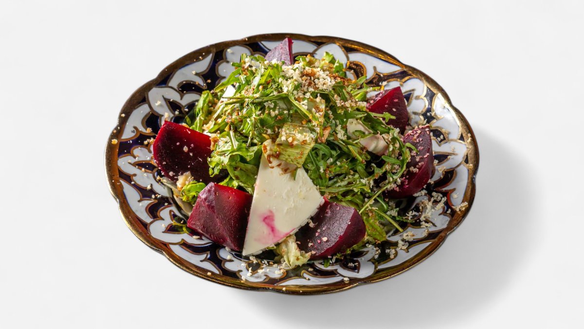 запеченная свекла с домашним сыром,руккола,айсберг,сулугуни,грецкий орех. 280гр