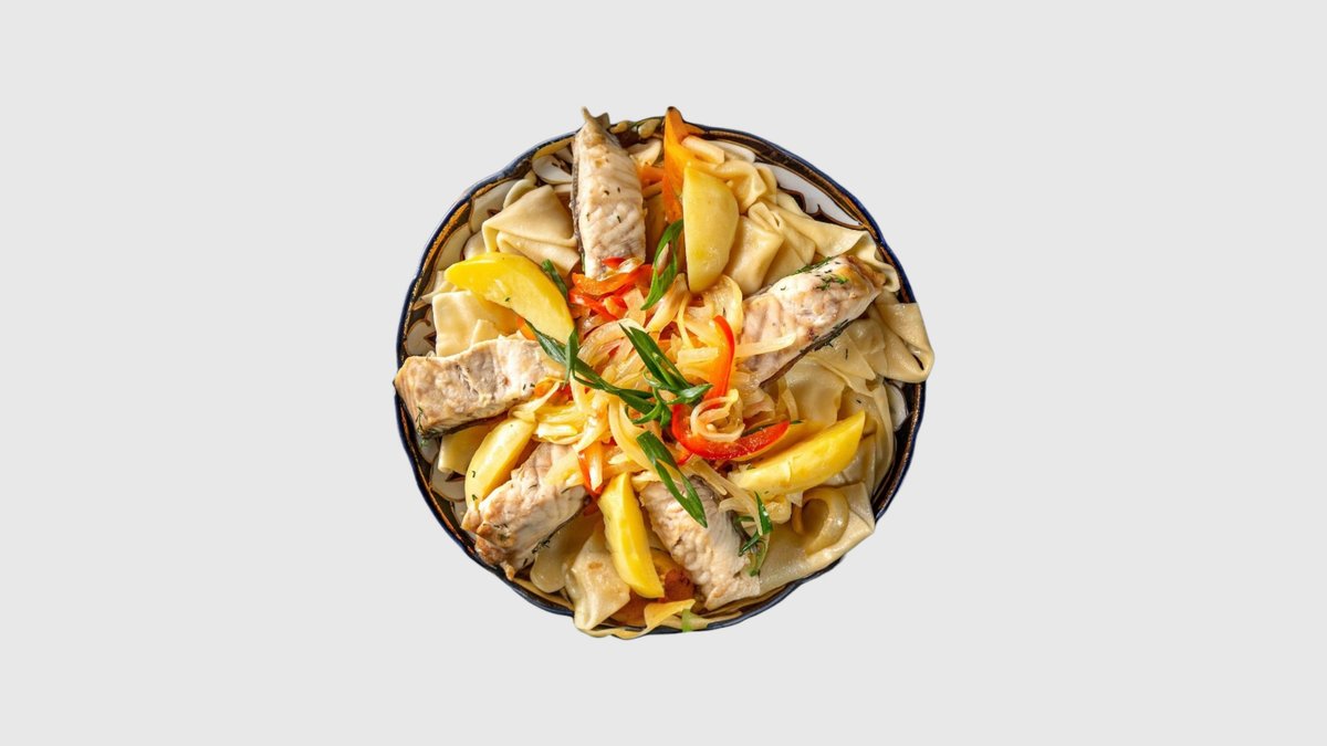 Наваристая шурпа с филе семги и судака.В составе также овощи и укроп.